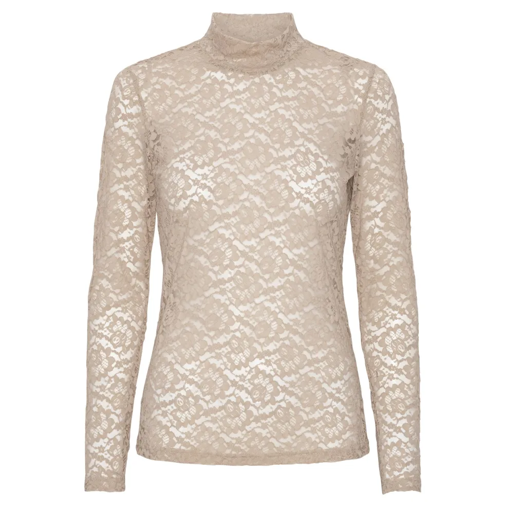 Blondebluse fra Continue i nude farve. Blusen har et blondemønster med blomster, der dækker hele stoffet. Den høje halsudskæring og den kropsnære pasform giver blusen et klassisk udtryk.