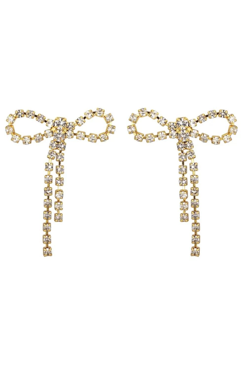Plissé Copenhagen laver sløjfeformede øreringe. De har et sløjfedesign øverst med to nedhængende stænger. Små sten dækker hele øreringen og giver et skinnende udtryk.