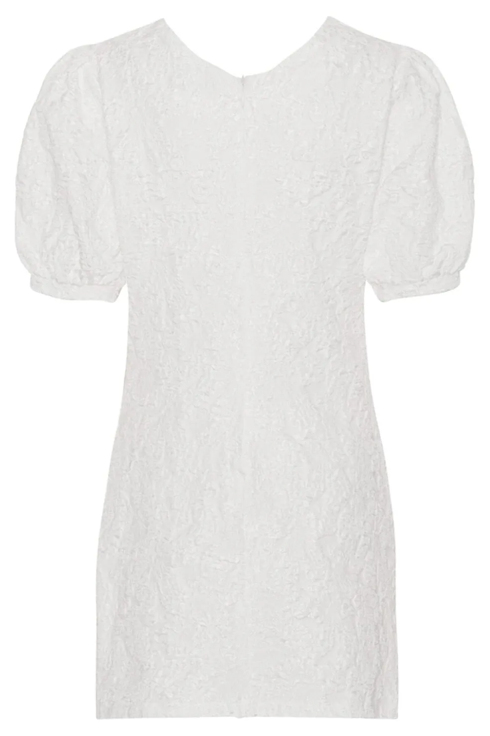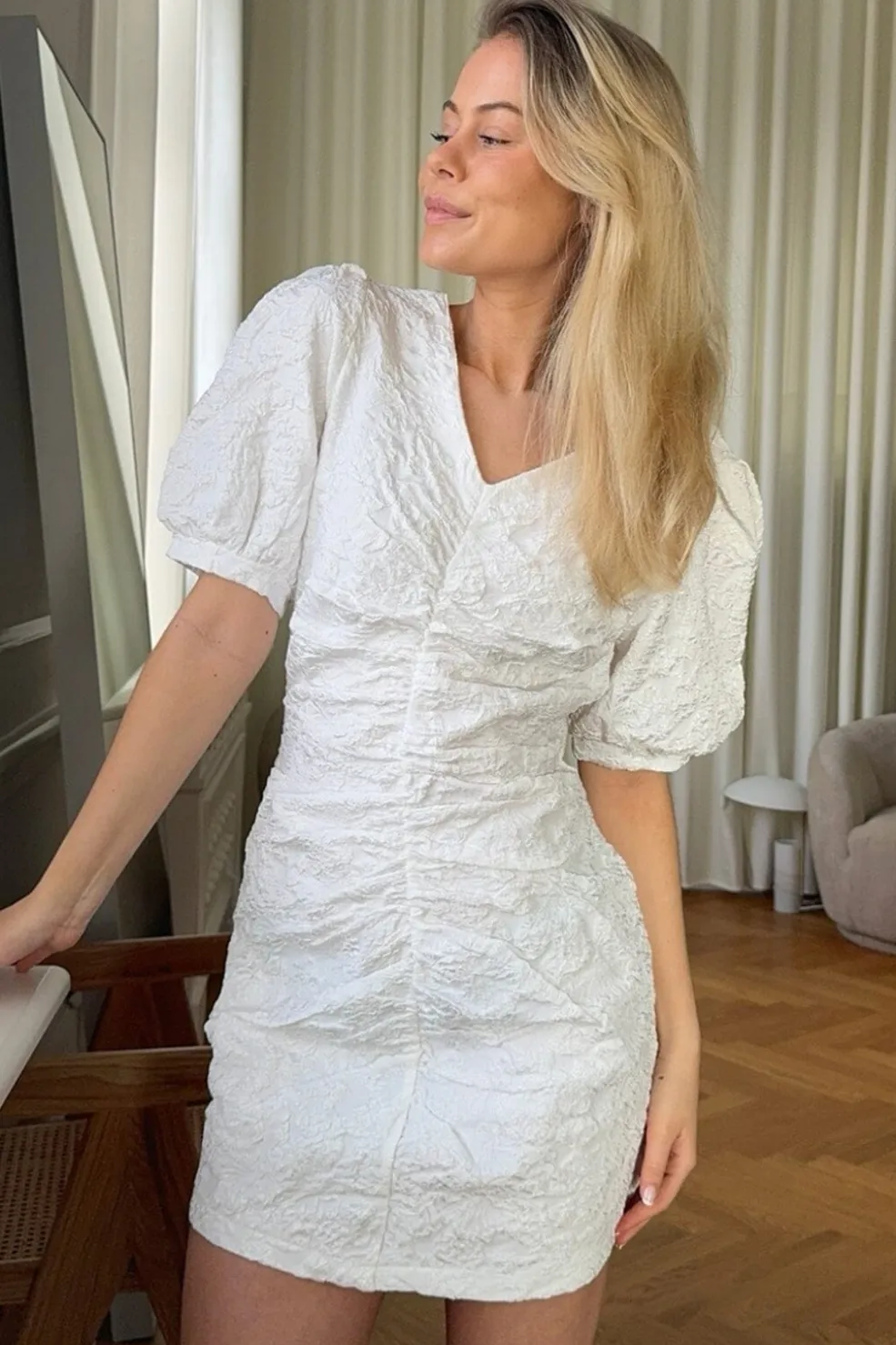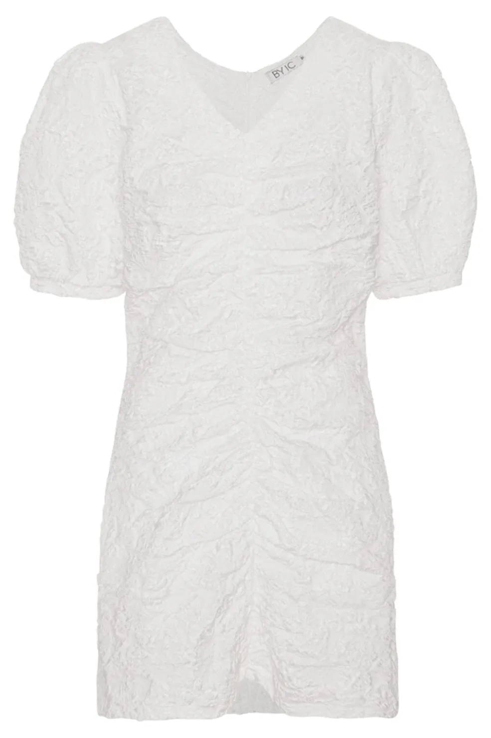 Hvid kjole fra BYIC med rynket tekstur og V-udskæring. Kjolen har korte pufærmer og en kort længde, der gør den velegnet til festlige begivenheder.