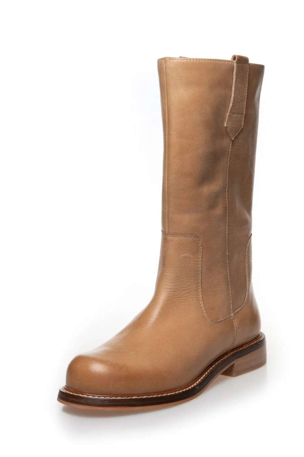 Mellemlang støvle i lysebrunt læder. Støvlen har rund tå, lav hæl og lynlås på indersiden. Materiale: Læder Sål: Neolite Skafthøjde: 31 cm målt på siden af en str. 37 Skaftomkreds: 38 cm målt ved øverste kant på en str. 37 Hæl: 3 cm Indersål: Læder og med 4-6 mm Copenhagen shoes foam