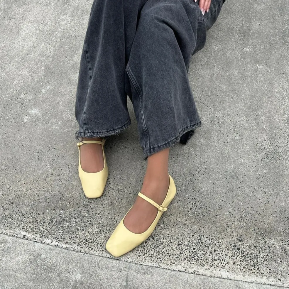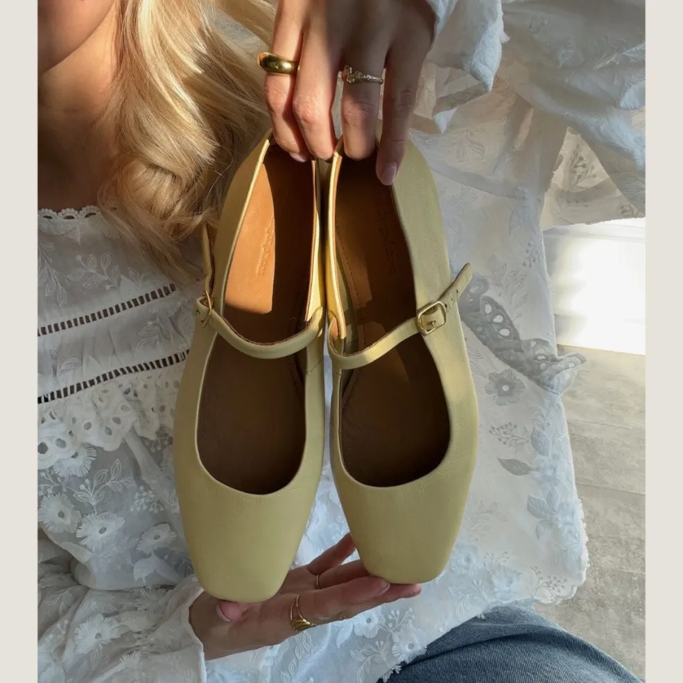 Gul ballerina fra Copenhagen Shoes med spids tå og spændelukning. Skoen er lavet i læder og har en lav sål.