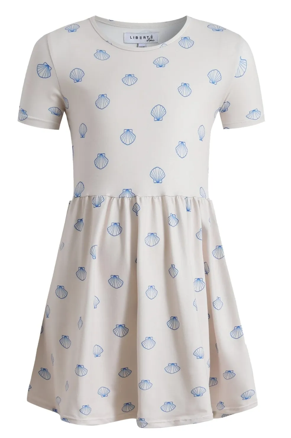 Babydoll-kjole fra Liberte Ami i Alma-kvalitet med elfenbenshvid bund og blå muslingemønster. Kjolen har en tætsiddende overdel og udsvunget nederdel med korte ærmer.