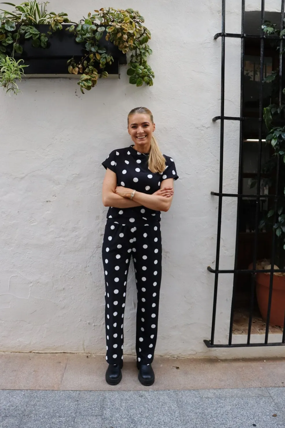 Kortærmet top fra Liberte i sort med store hvide prikker. Toppen er lavet i den bløde Alma-kvalitet med en rund halsudskæring.