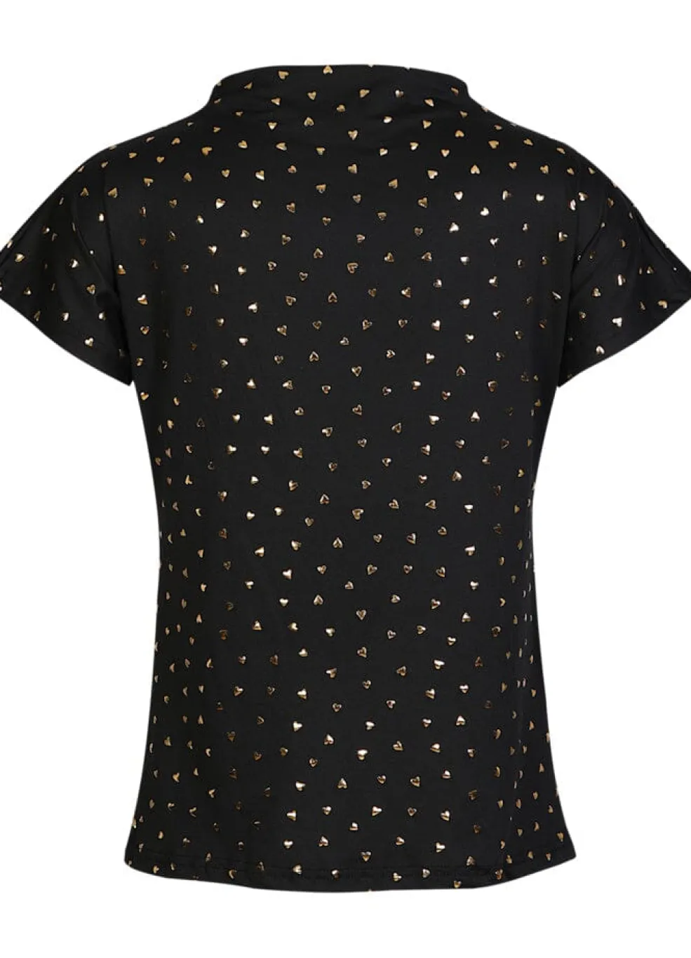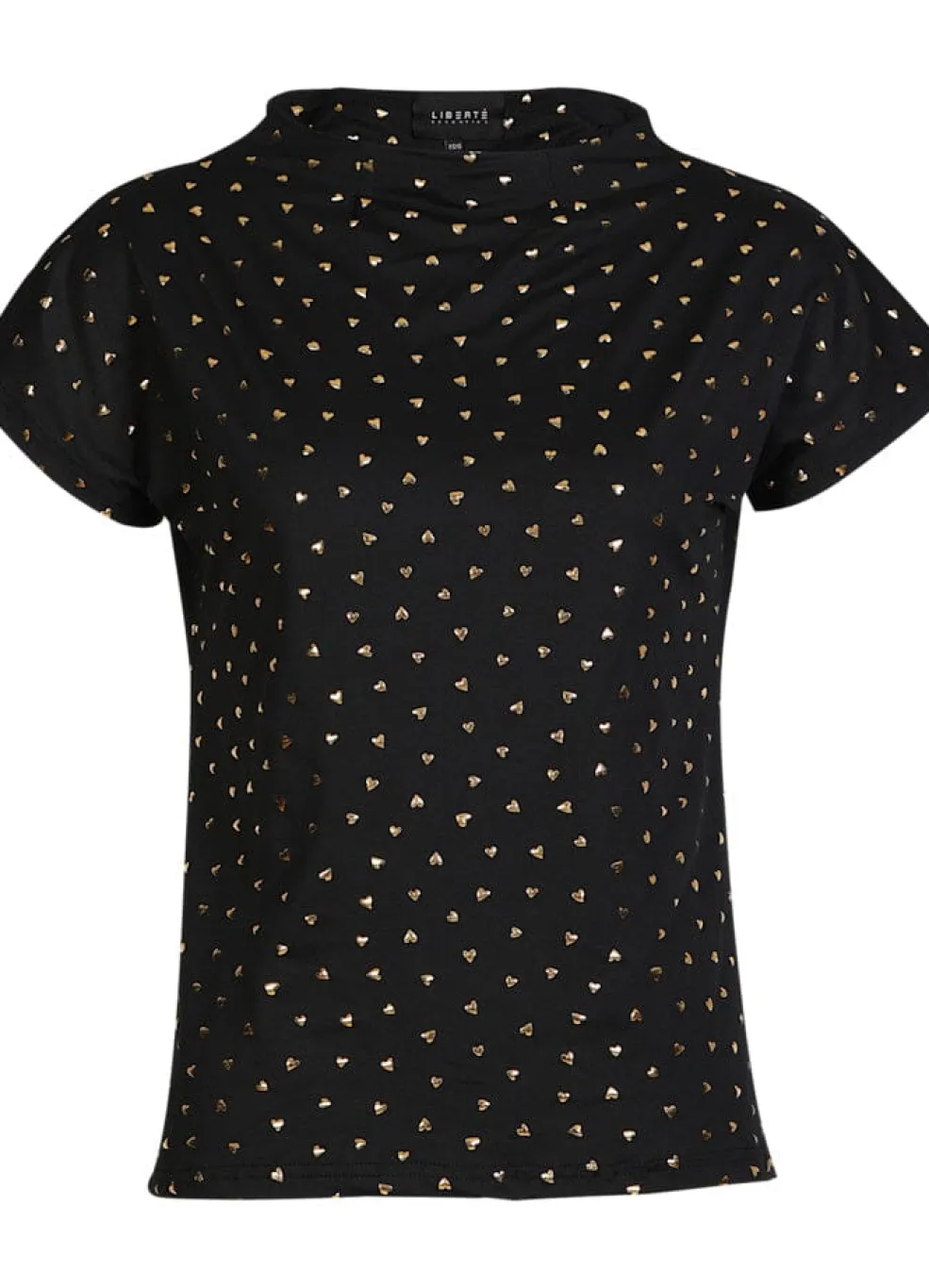 Sort top fra Liberte med små gyldne hjerter spredt over hele stoffet. Toppen har korte ærmer og en høj halsudskæring.