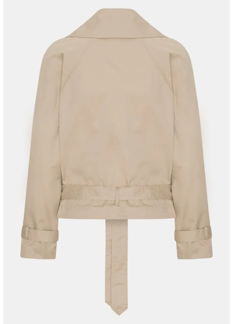 Kort trenchcoat fra BYIC i lys beige. Den oversized jakke har en skjortekrave og 3/4 ærmer med knapper samt bælte om taljen.