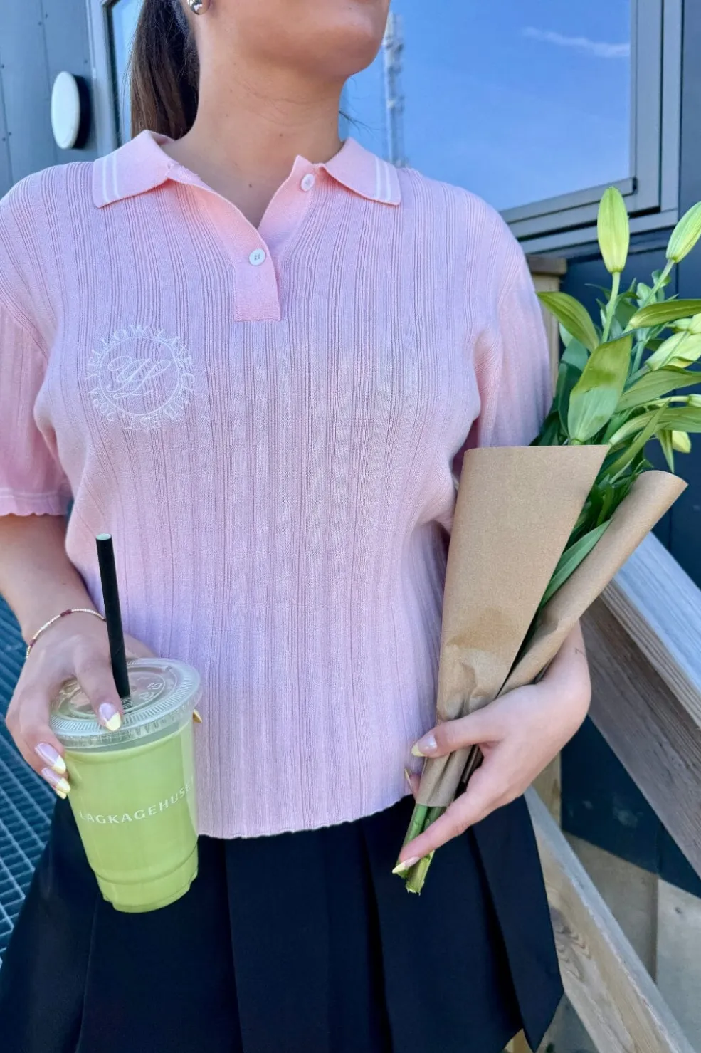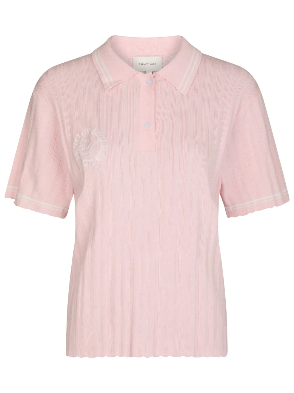 Lyserød polo fra Yellow Lane i ribstrikket design. Den har en klassisk polokrave med knaplukning og hvide kontraststriber på krave og ærmer. Det broderede klublogo på forsiden giver poloen et sporty præg.