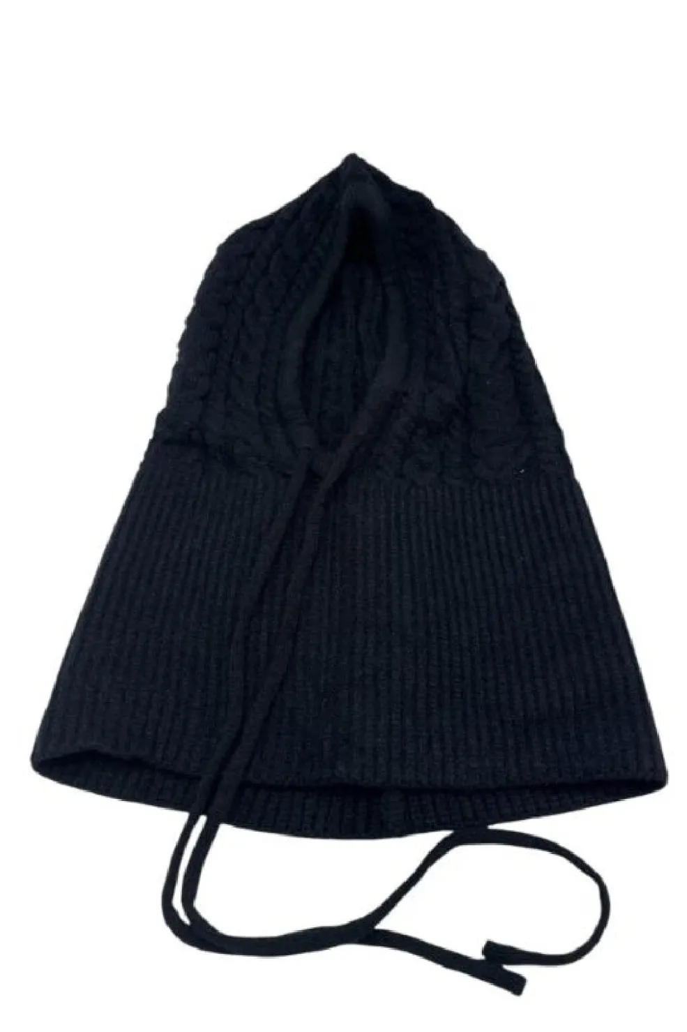 Sort balaclava fra A-bee med kabelstrik på den øverste del og ribbet tekstur nederst. De justerbare snore giver mulighed for tilpasning.