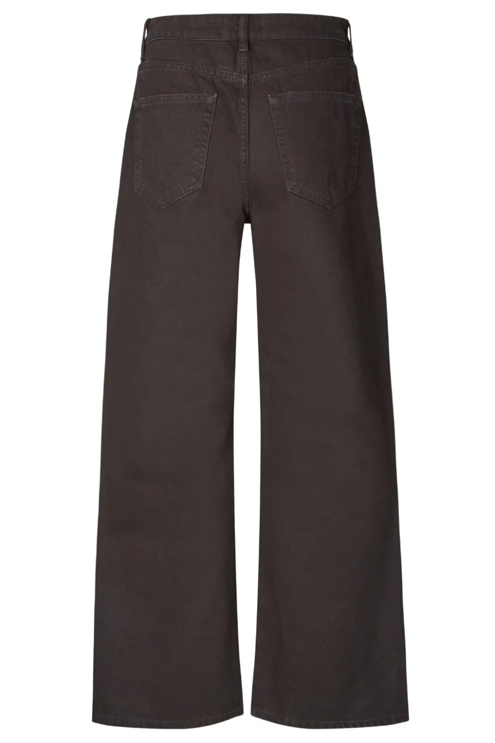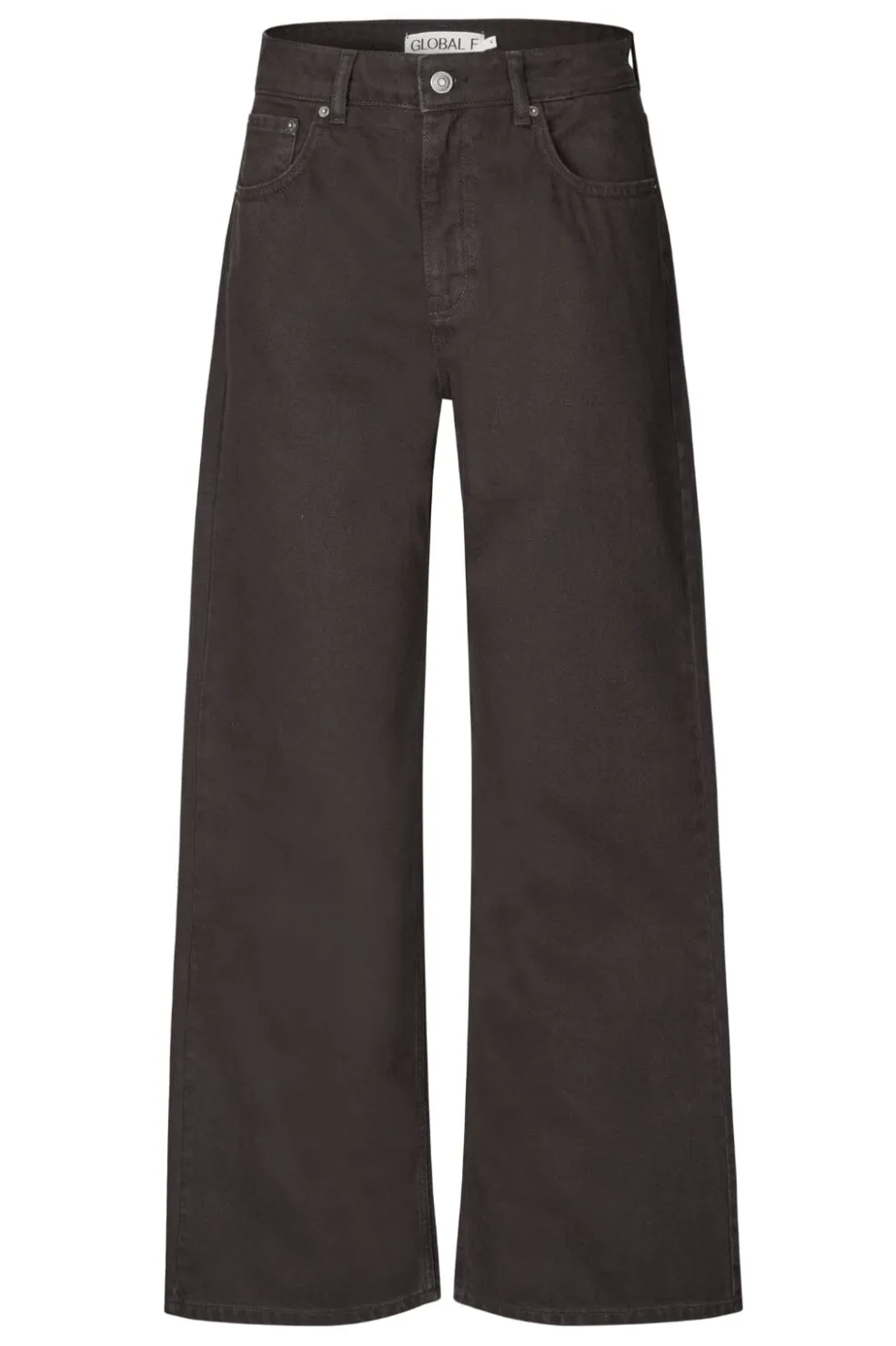 Bomuldsbukser fra Global Funk i en mørk espressofarve. Bukserne har bred benvidde og går helt ned til gulvet. De er lavet af et rent bomuldsmateriale med normal talje.