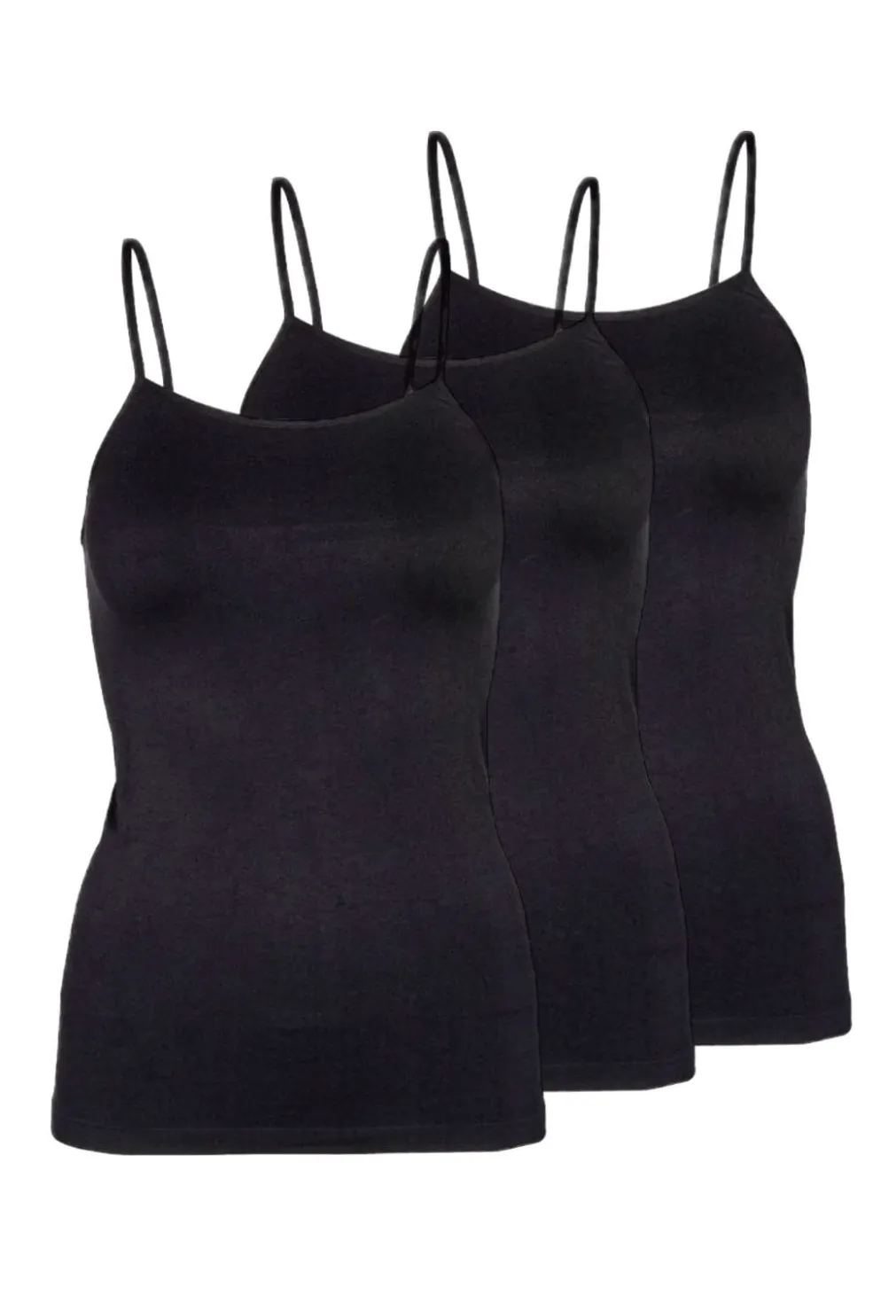 Sorte toppe fra Mollyogmy. dk i en 3-pak. Toppene har en tætsiddende pasform med rund halsudskæring og tynde stropper. De er ensfarvede og kan trækkes over hovedet.