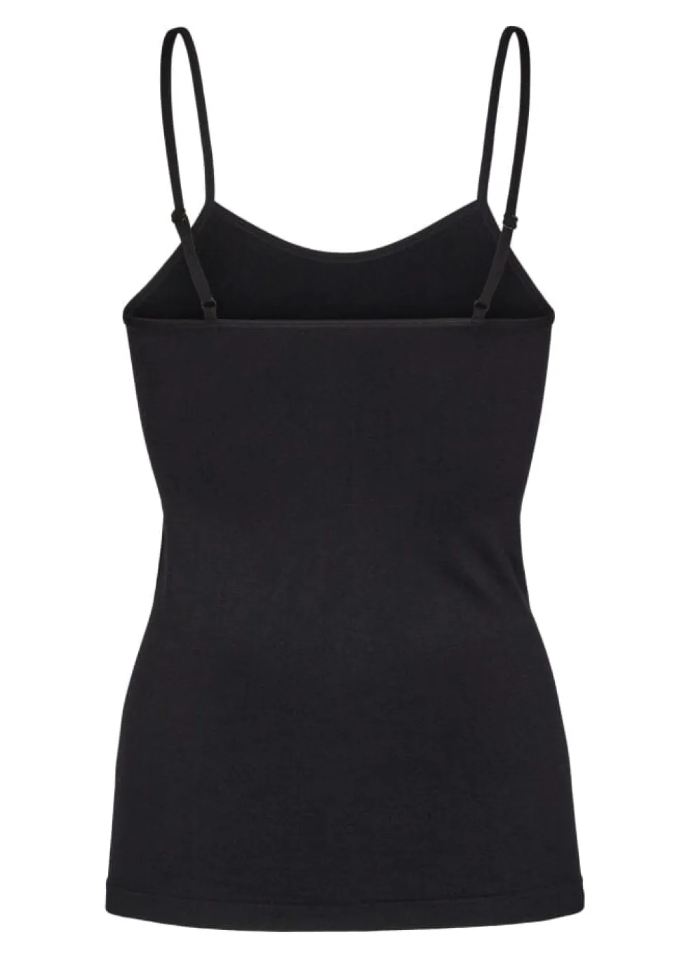 Sort top fra Amazing Basic med tynde stropper og rund halsudskæring. Toppen har en tætsiddende pasform og er lavet af et elastisk materiale, der følger kroppens bevægelser.