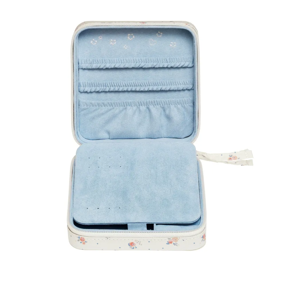 Lyseblåt smykkeskrin fra Maanesten med broderet hjerte på forsiden. Skrinet har en hvid base med små blomstermotiver og blå sløjfedetaljer langs kanten.