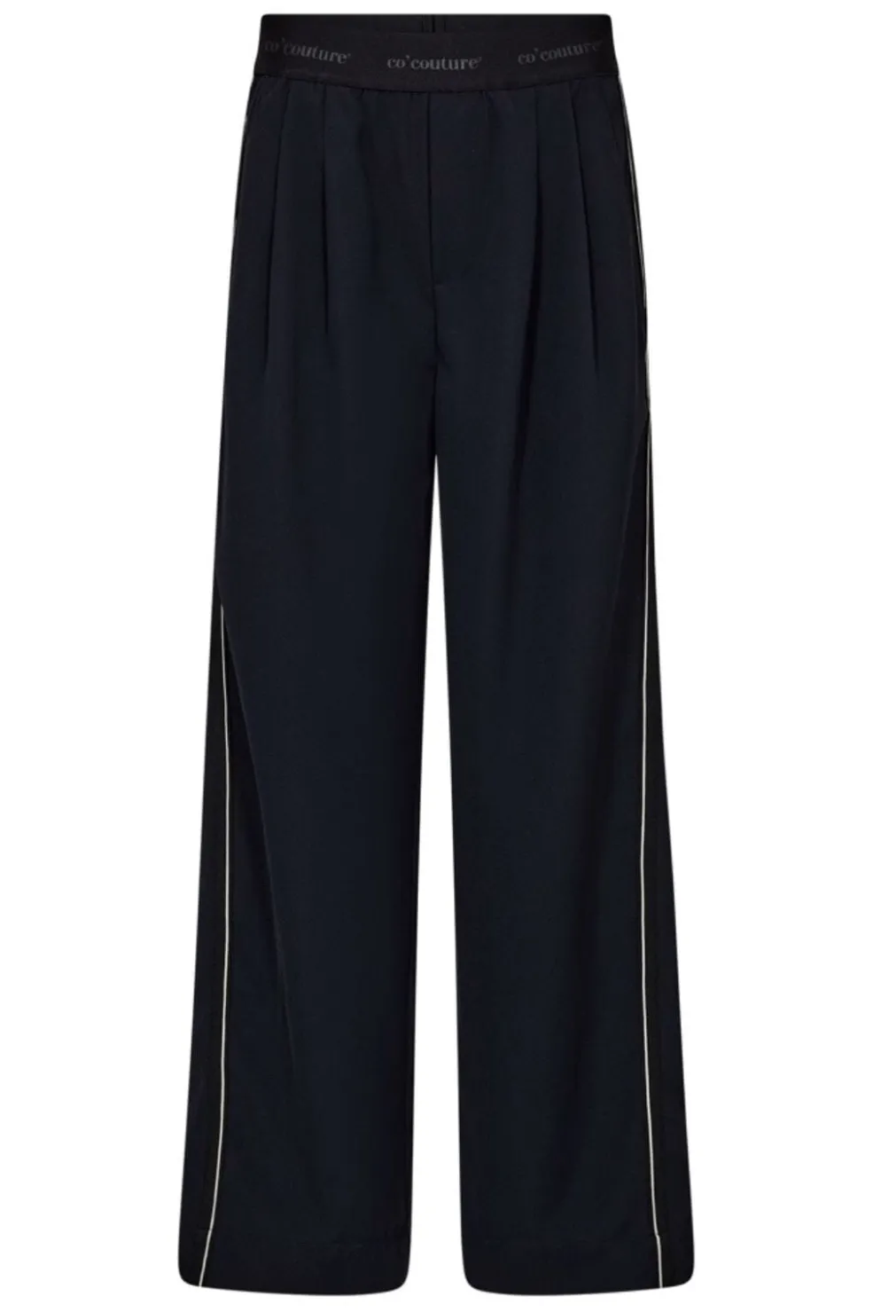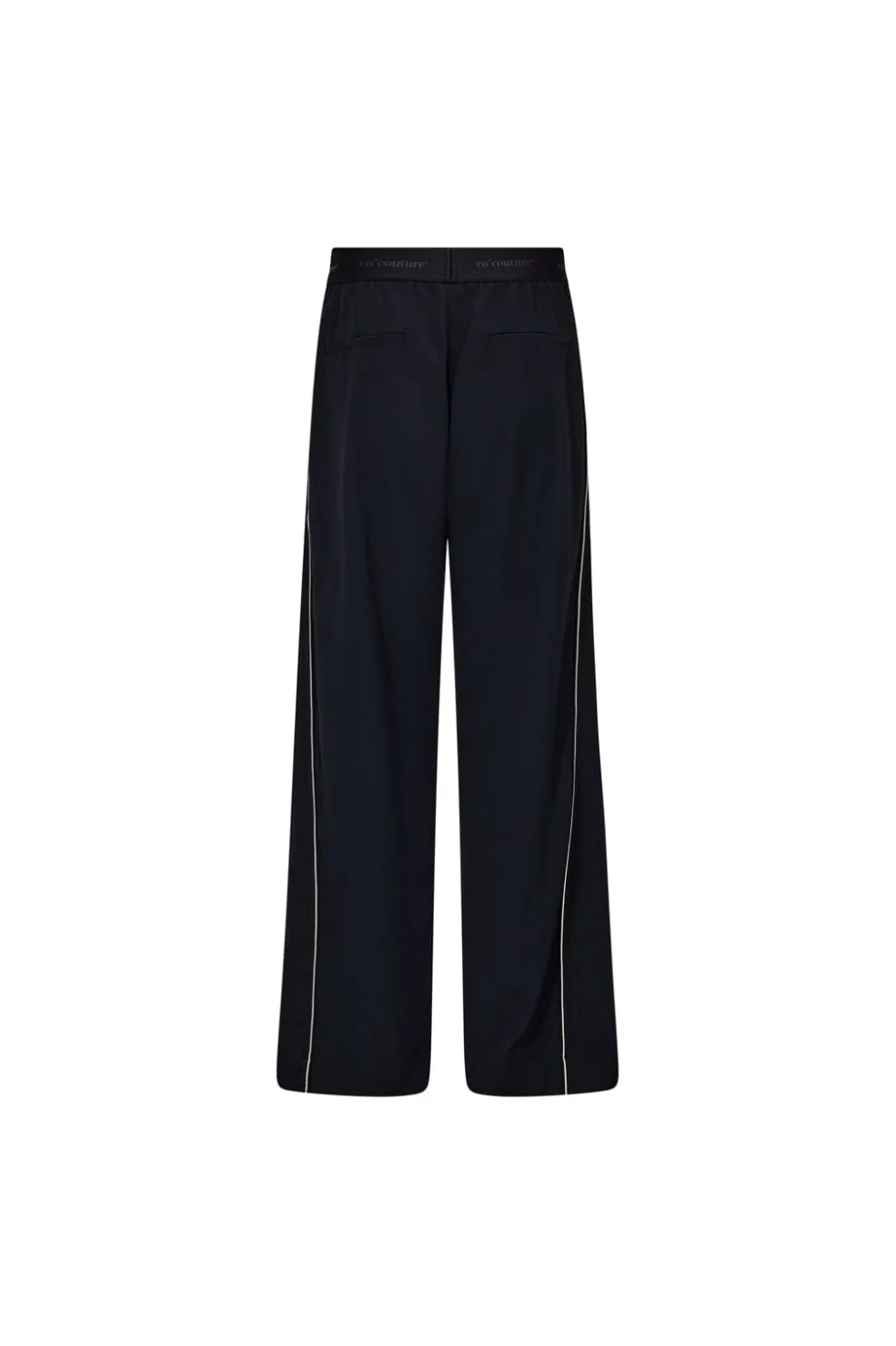 Bukser fra Co´Couture i navy med dekorative syninger og lodrette striber langs siderne. Bukserne har en høj talje og bred benform.
