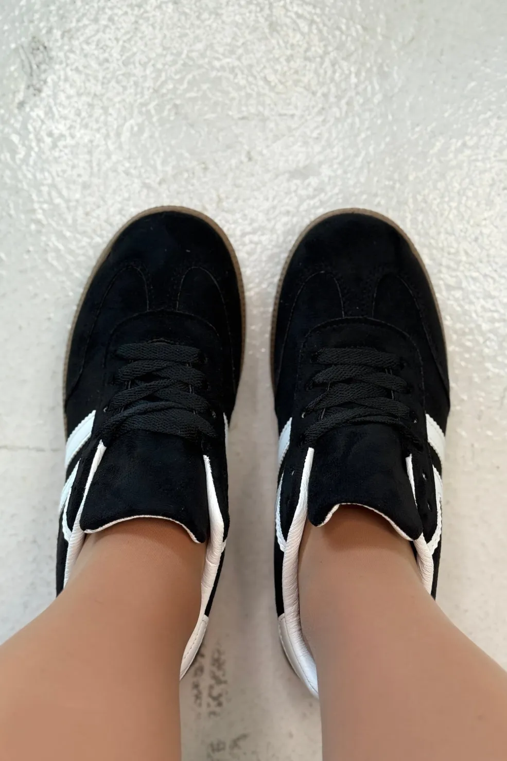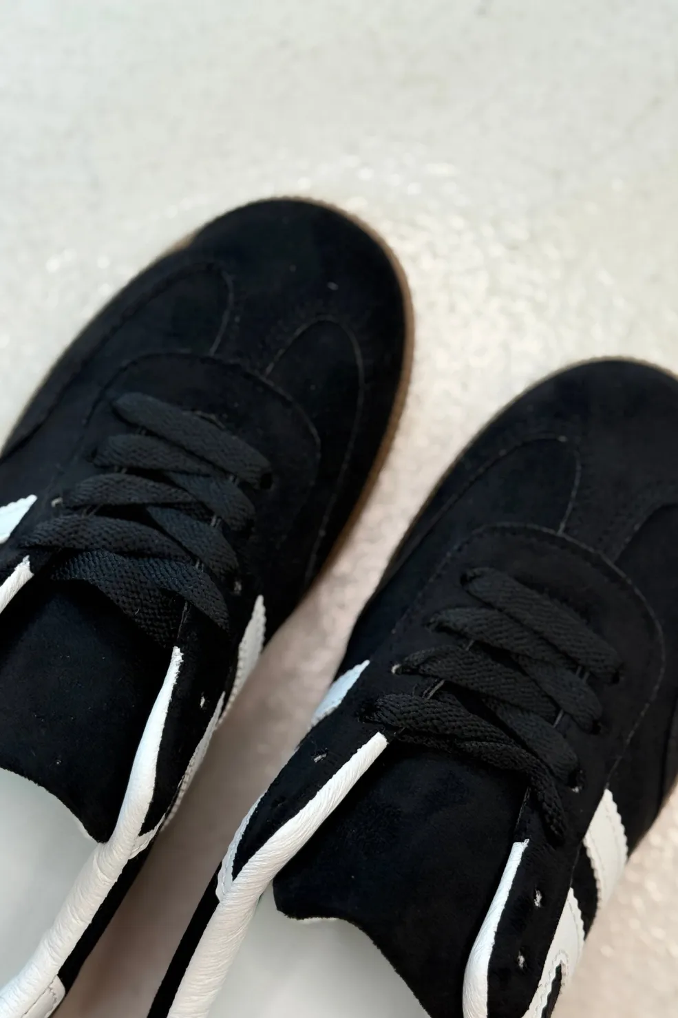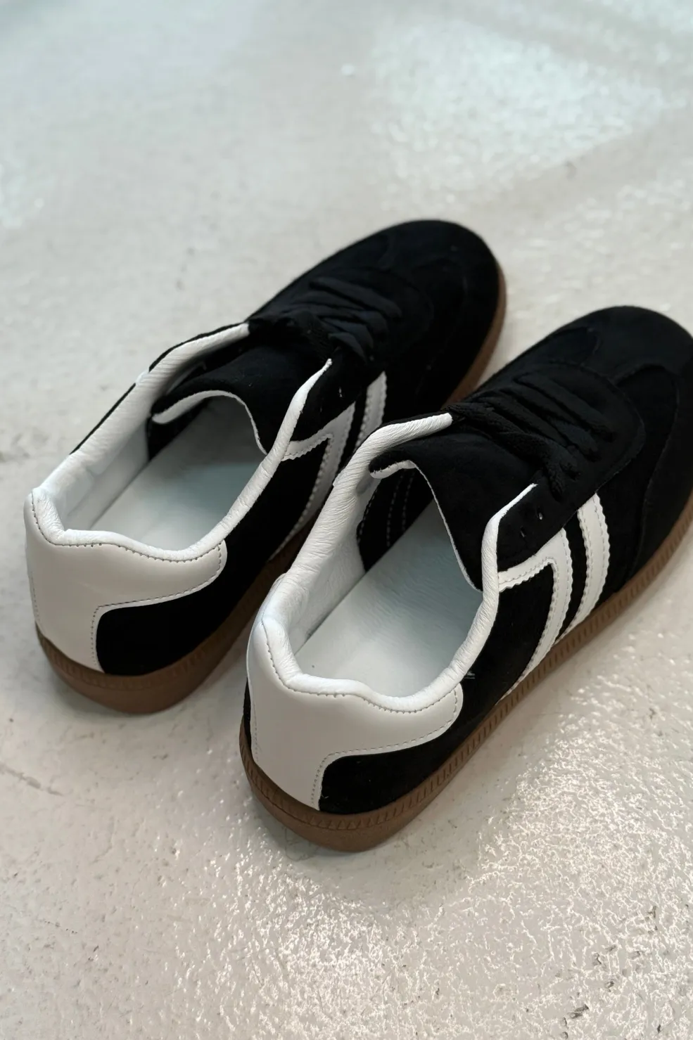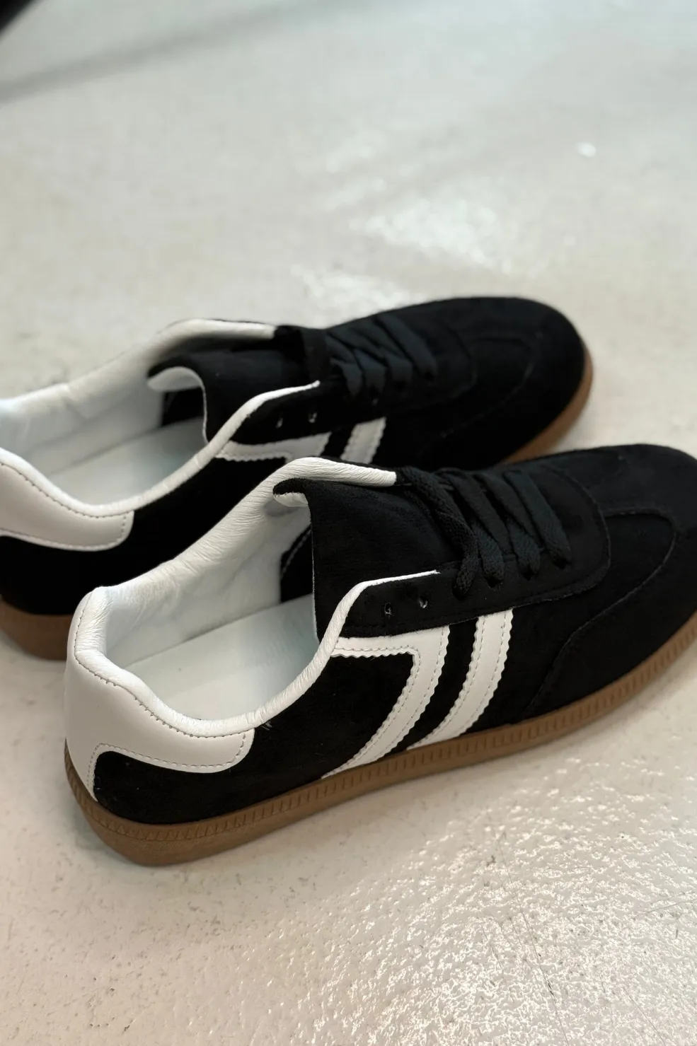 Sort sneaker fra Bloom med hvide striber på siden og brun sål. Skoen har sorte snørebånd og en rund tå.