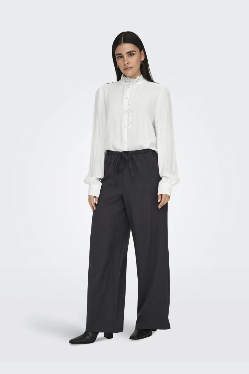 Hvid skjorte fra JDY med flæser og blondedetaljer. Skjorten har lange ærmer med volumen og en klassisk skjortekrave med rynket kant. Knapperne foran gør den nem at tage på.