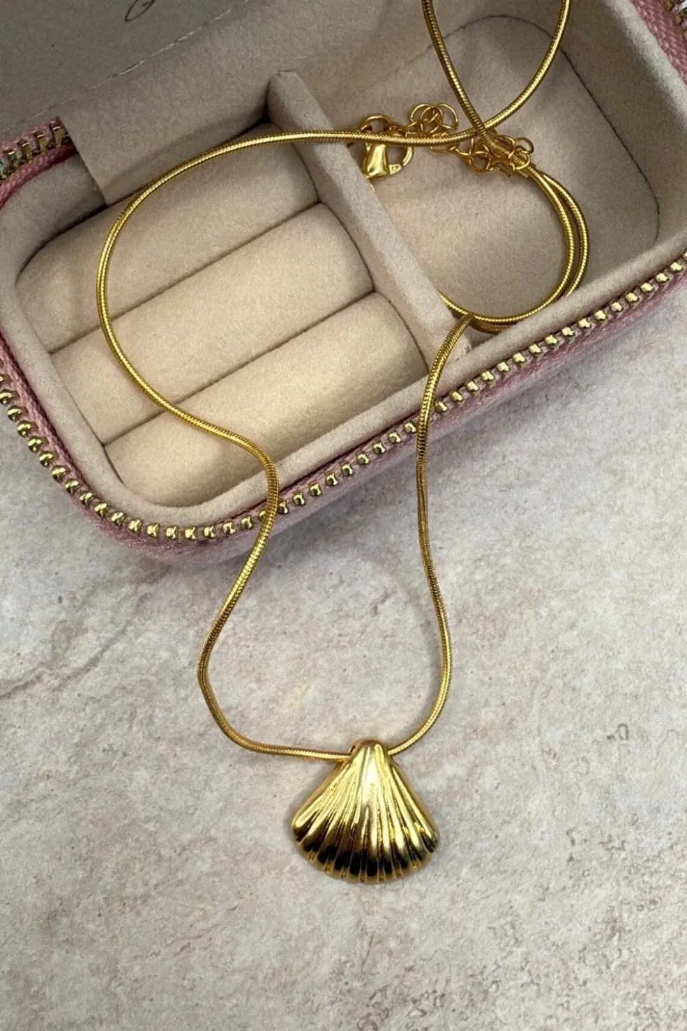 Halskæde fra Molly&My Jewellery med et muslingeformet vedhæng i forgyldt rustfrit stål. Kæden har en glat struktur og leveres i en lyserød smykkeæske.