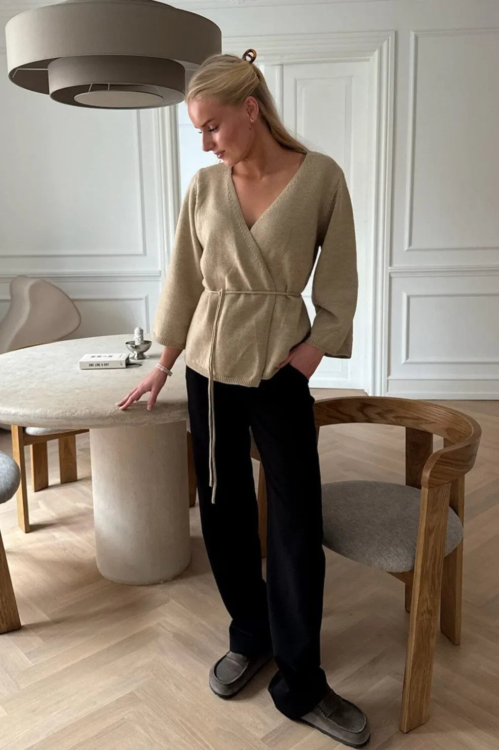 Beige cardigan fra BYIC med omslagsdesign og bindebånd i taljen. Den strikkede cardigan har V-hals og 3/4 ærmer med en god balance mellem varme og komfort.
