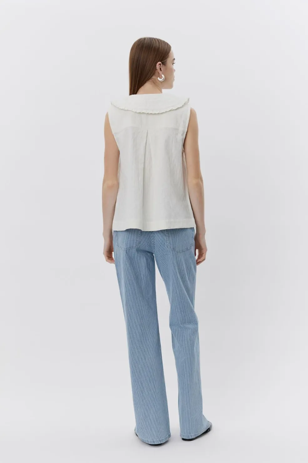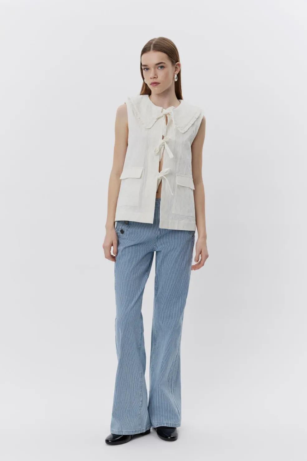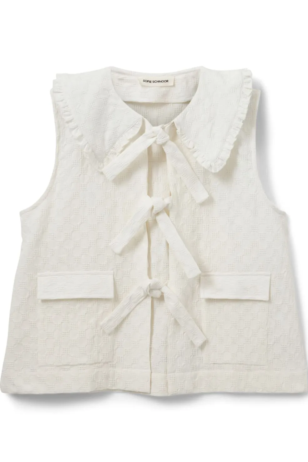 Hvid vest fra Sofie Schnoor med print og Peter Pan-krave. Vesten har rynkede flæser langs kraven og lukkes med sløjfer foran. To lommer på forsiden giver praktisk opbevaringsplads.