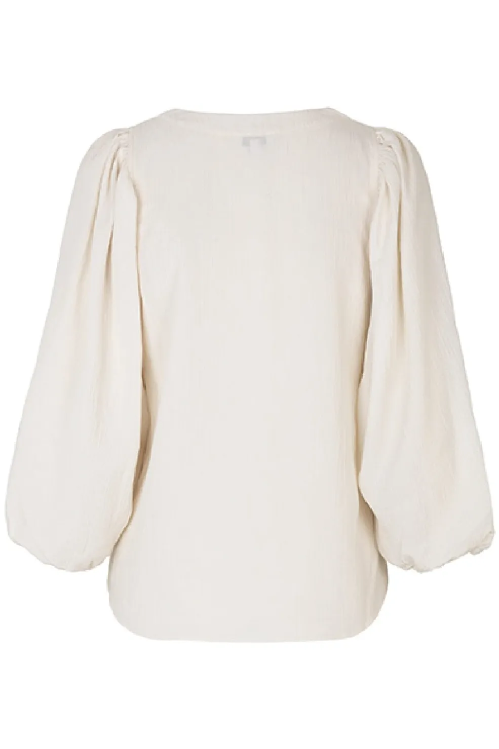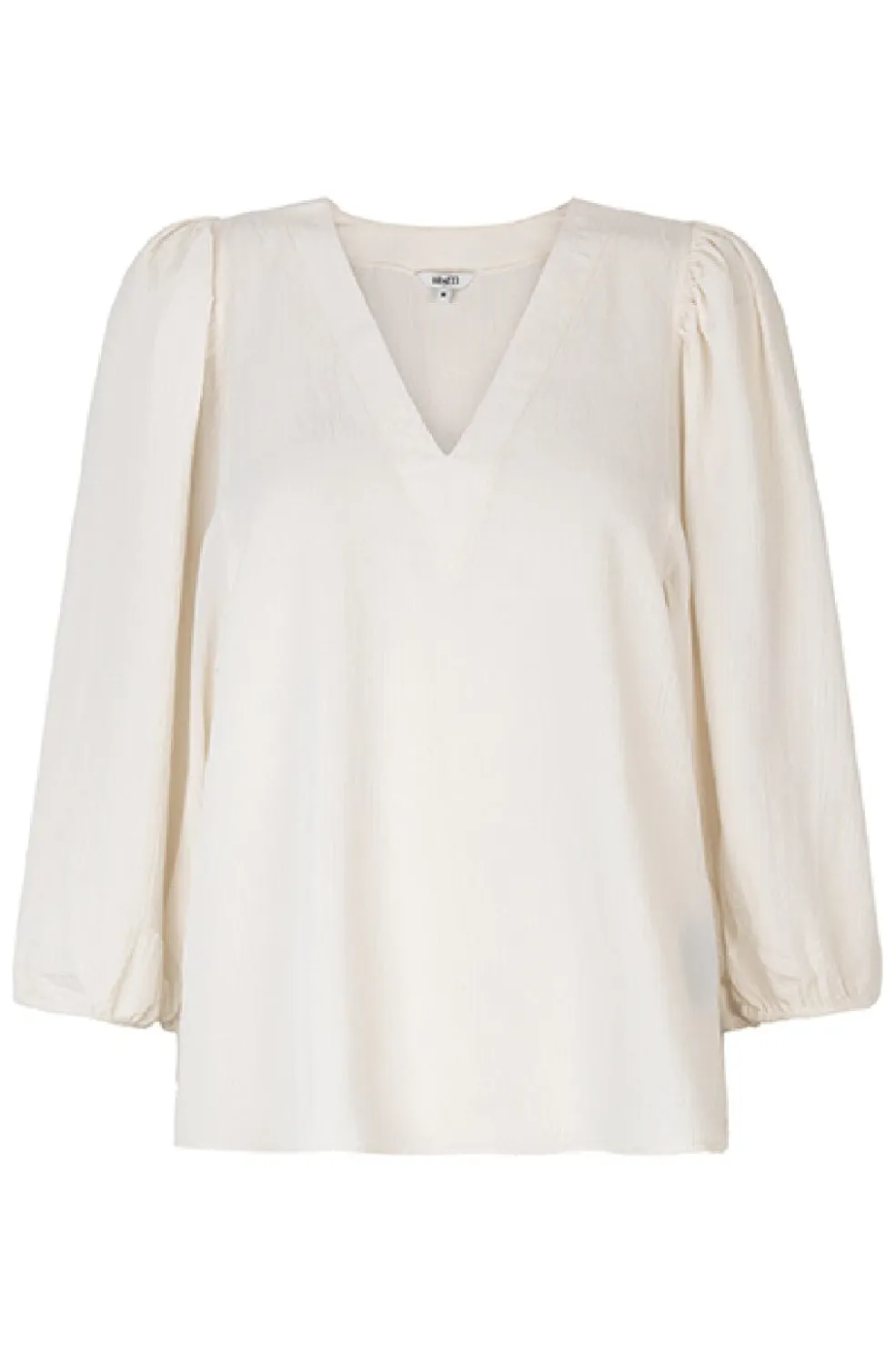 Cremefarvet bluse fra MbyM med V-udskæring og pufærmer. Blusen har en løs pasform og er lavet af blødt materiale med god åndbarhed.