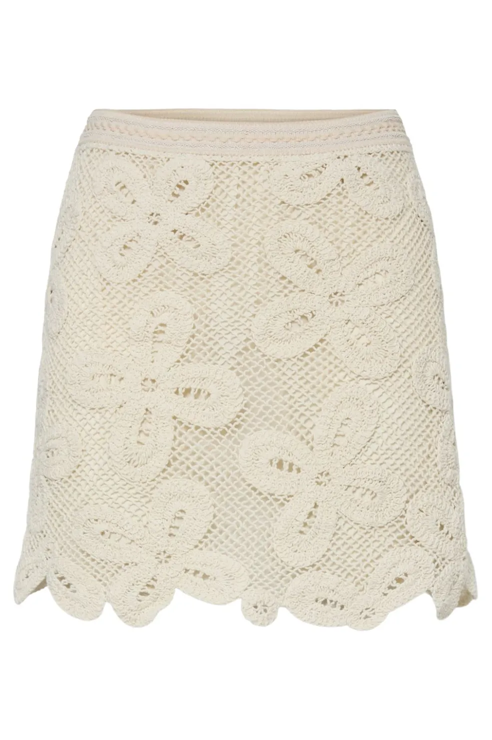 Hæklet nederdel fra Y. A.S i en lys beige nuance. Nederdelen har et gennemgående blomstermønster i hæklet design og en bølget kant forneden.