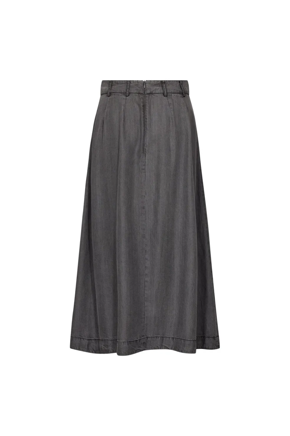 Plisseret nederdel fra Co´Couture i mellemgrå. Nederdelen er lavet af 100 % Lyocell og har en høj talje med bæltestropper. Læggene foran og bagpå giver volumen.