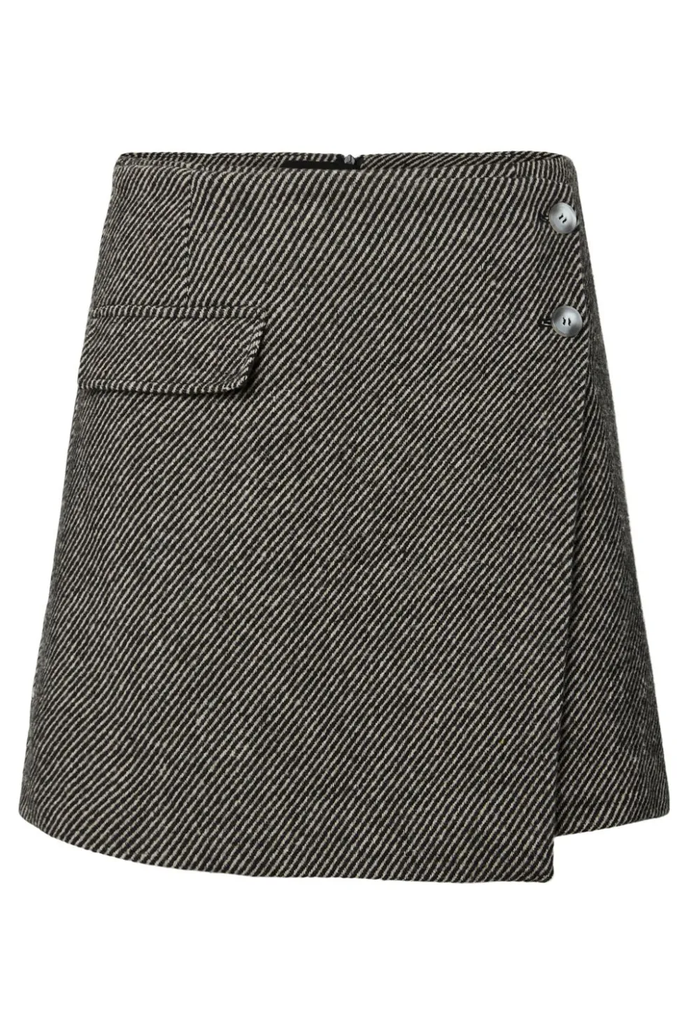 Sort nederdel fra Y. A.S med diagonale striber. Den har høj talje og en flaplomme på forsiden med to knapper på højre side.