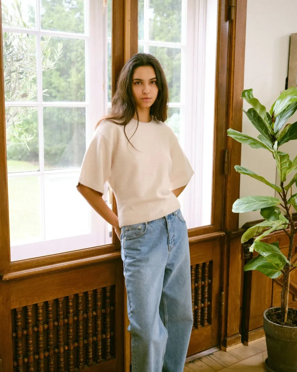 T-shirt fra Neo Noir i en lys beige farve. Den har en boxy pasform ved skuldrene og korte ærmer med en rund halsudskæring.