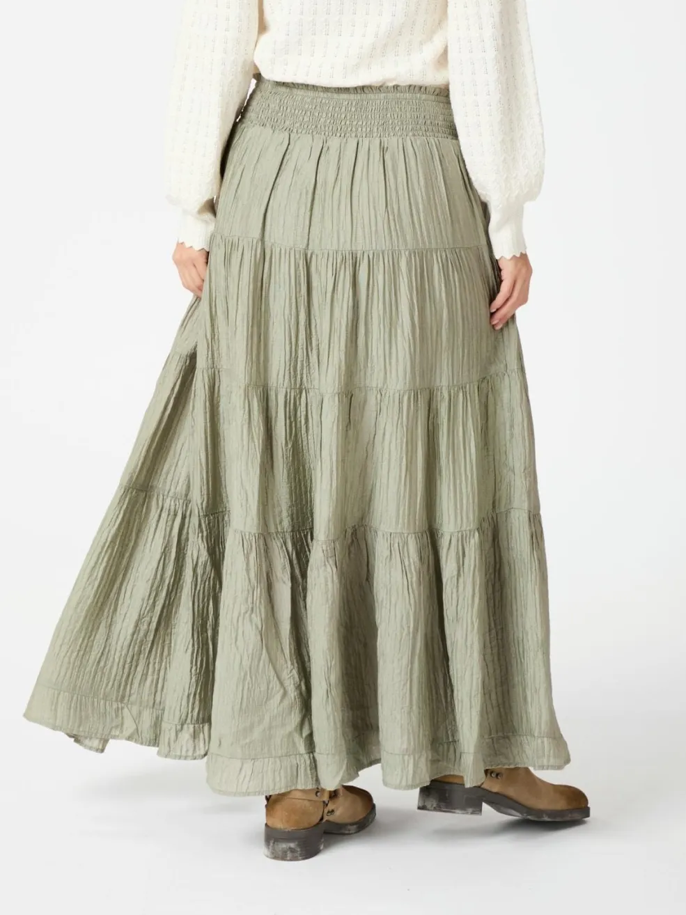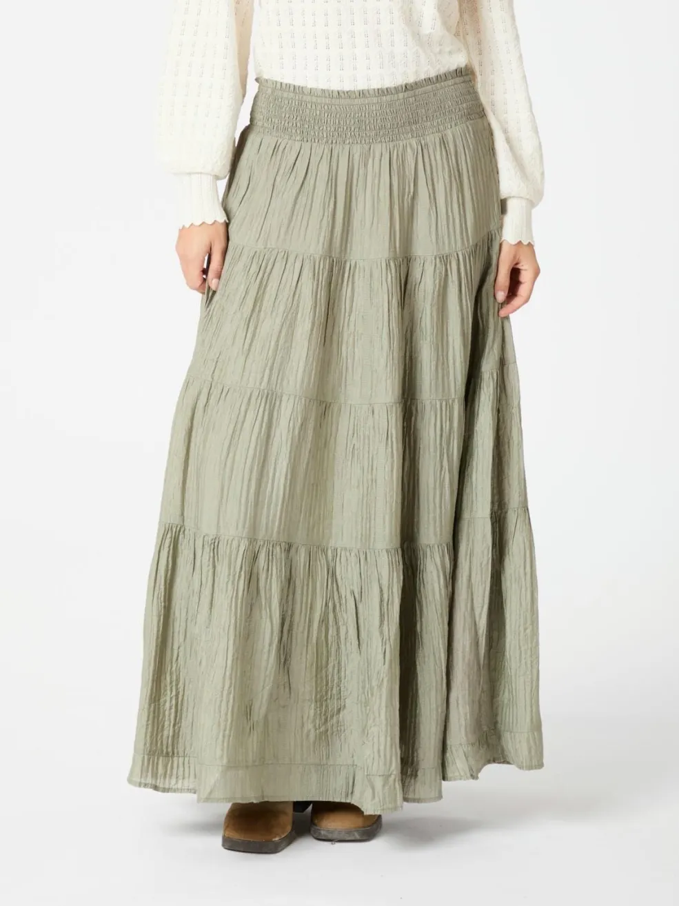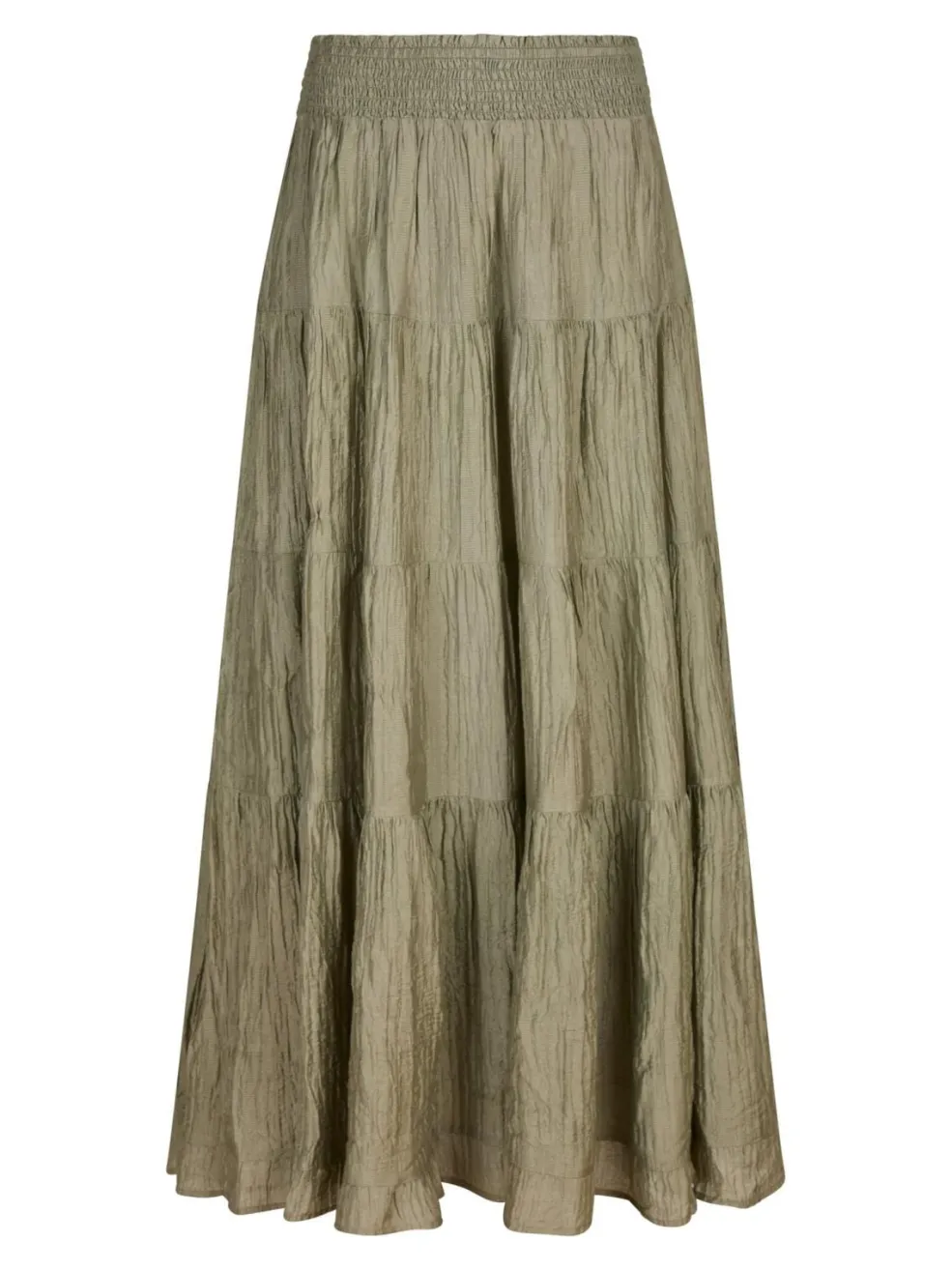 Røggrøn nederdel i crepemateriale med lagdelt design. Den høje talje har elastik, og nederdelen går til anklerne. Crepe-stoffet skaber en naturlig tekstur i den grønne farve.