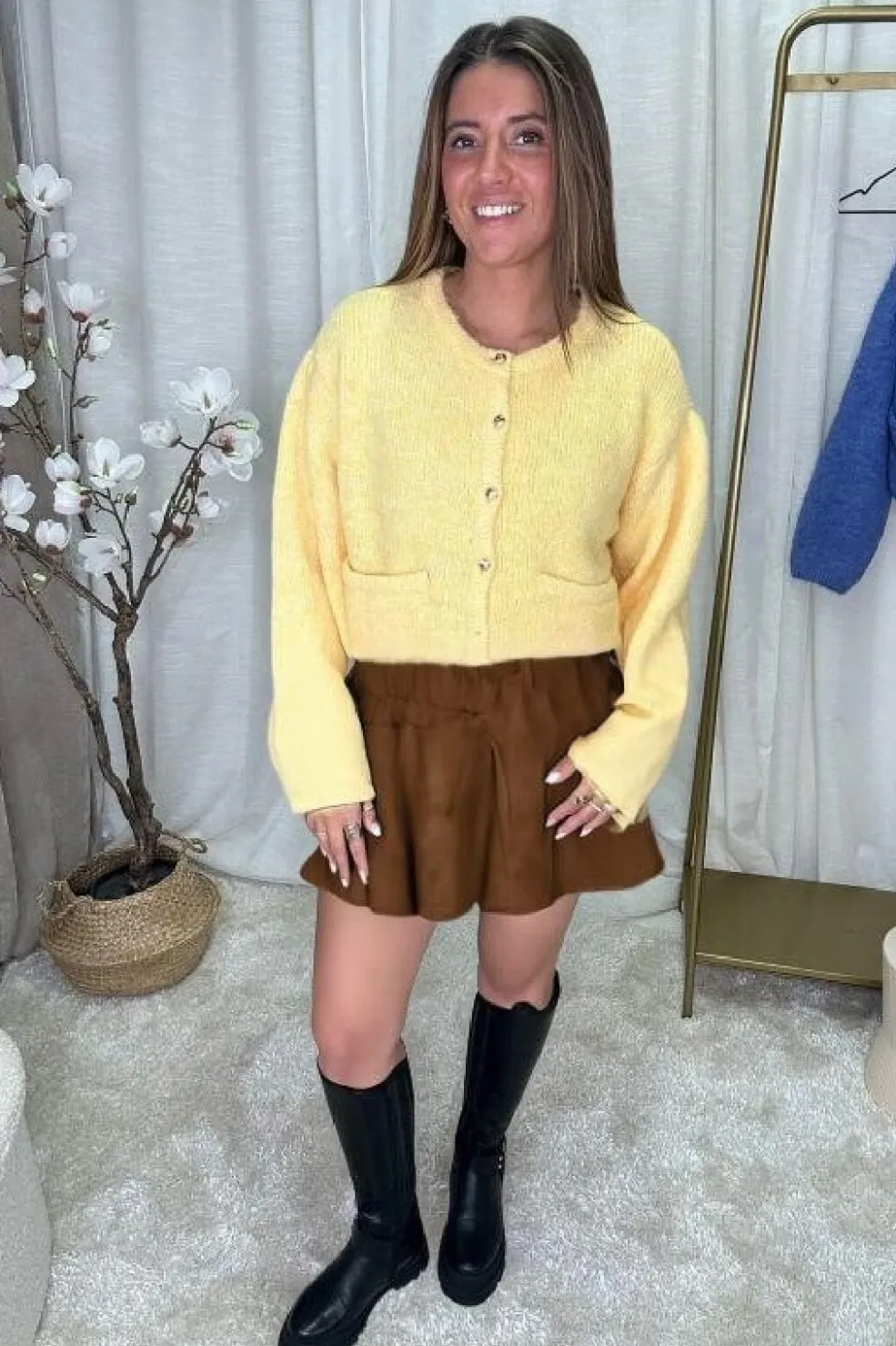 Mørkebrun nederdel fra A-bee med plisserede detaljer. Den korte model har en flared pasform og elastik i taljen, hvilket gør den nem at tage på og af.