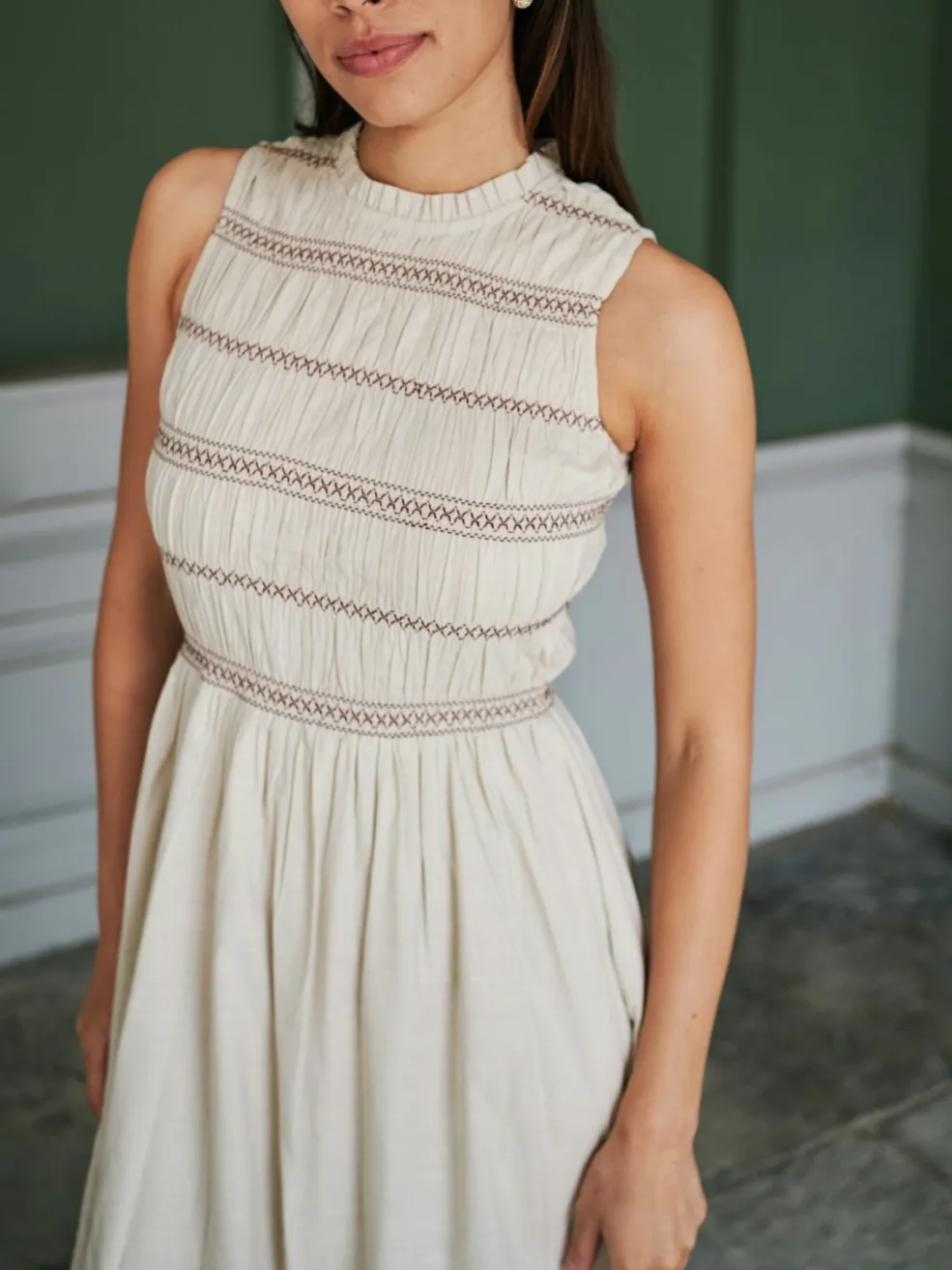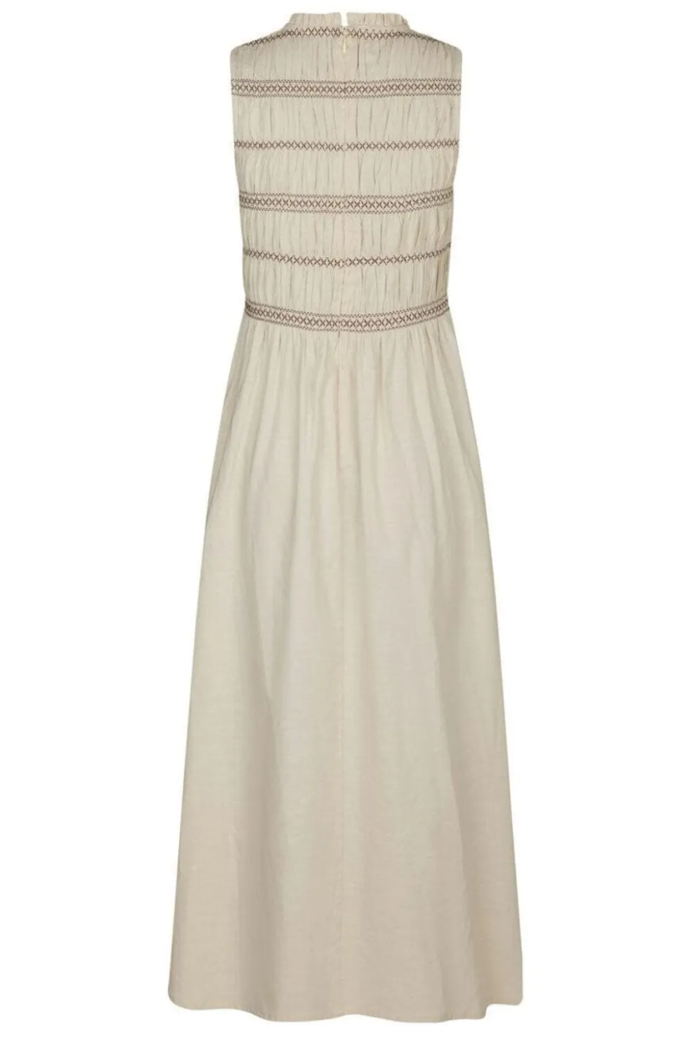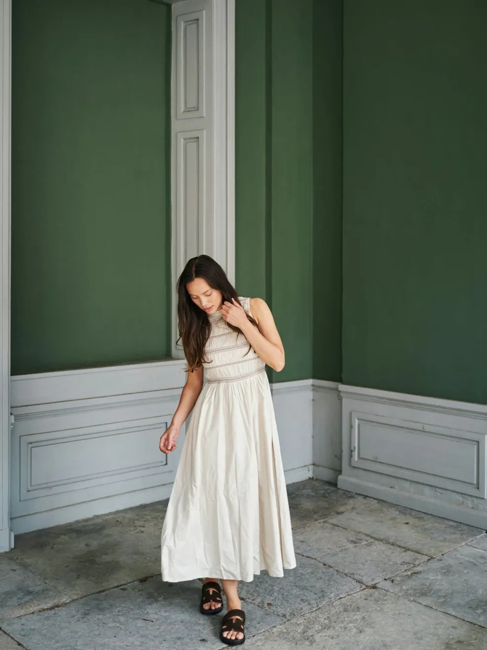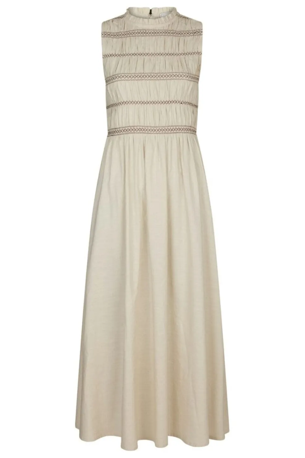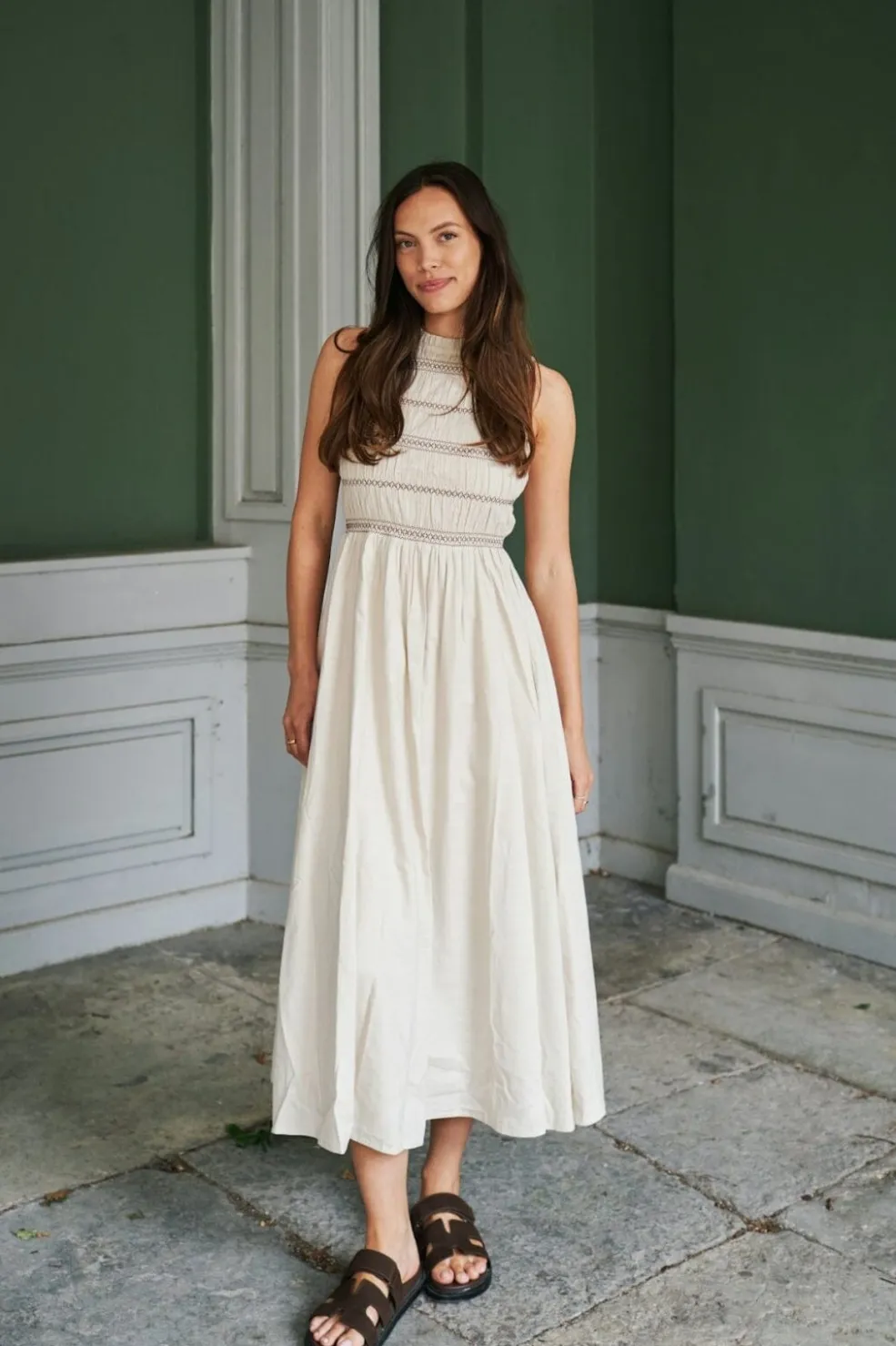 Ærmeløs kjole fra Neo Noir i cremehvid bomuld. Kjolen har smock-detaljer på overdelen og en høj halsudskæring. Nederdelen falder løst til midt på læggen.