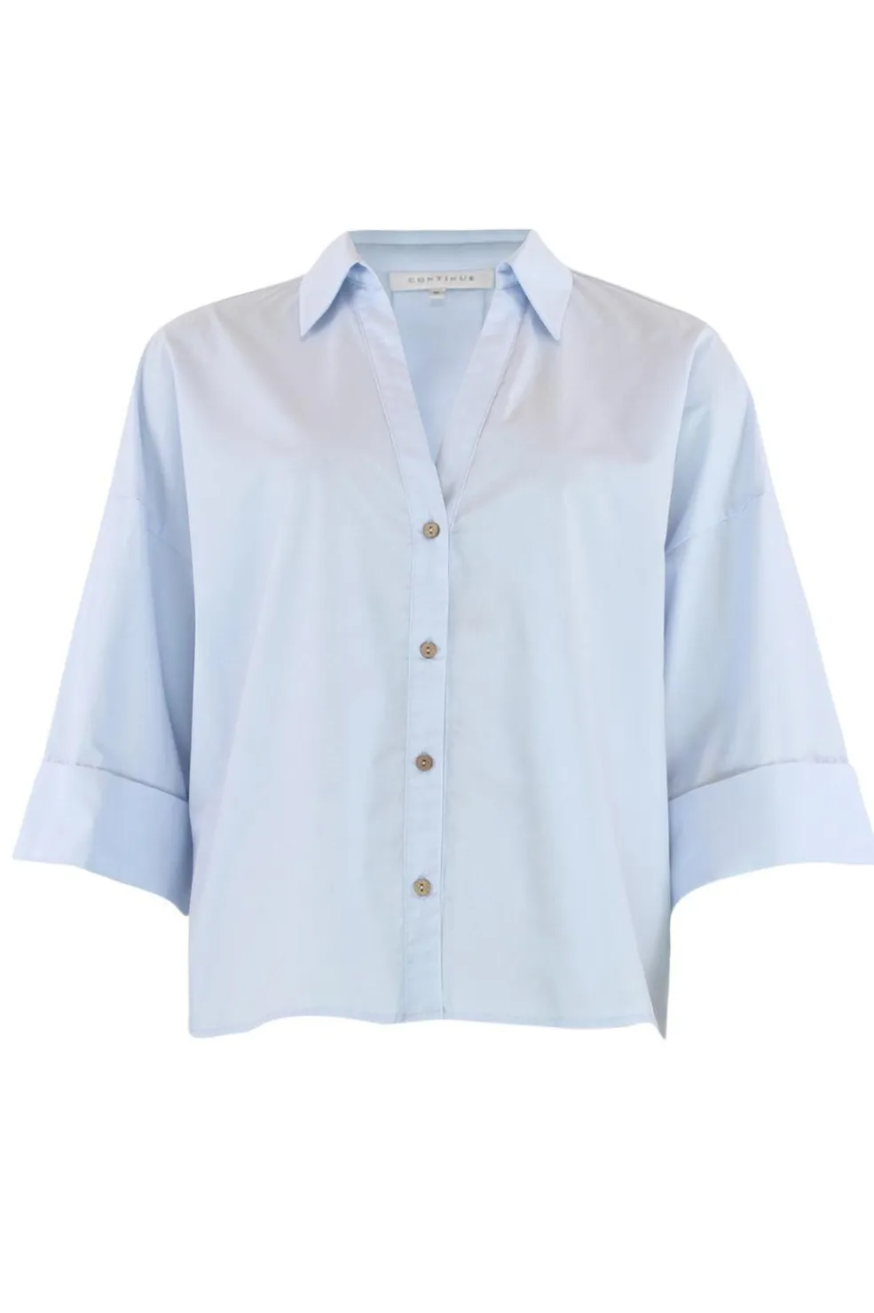 Lyseblå skjorte fra Continue med oversized pasform. Skjorten har 3/4-ærmer med brede manchetter og en knaplukning foran.