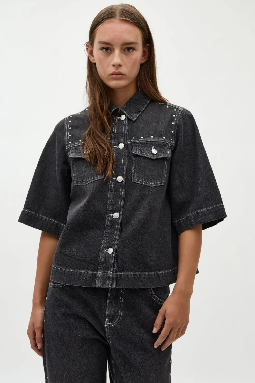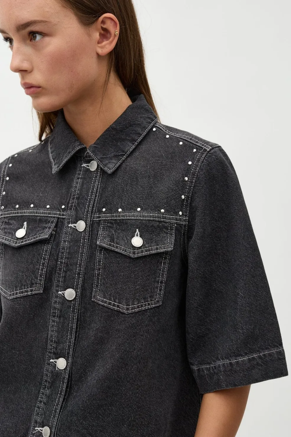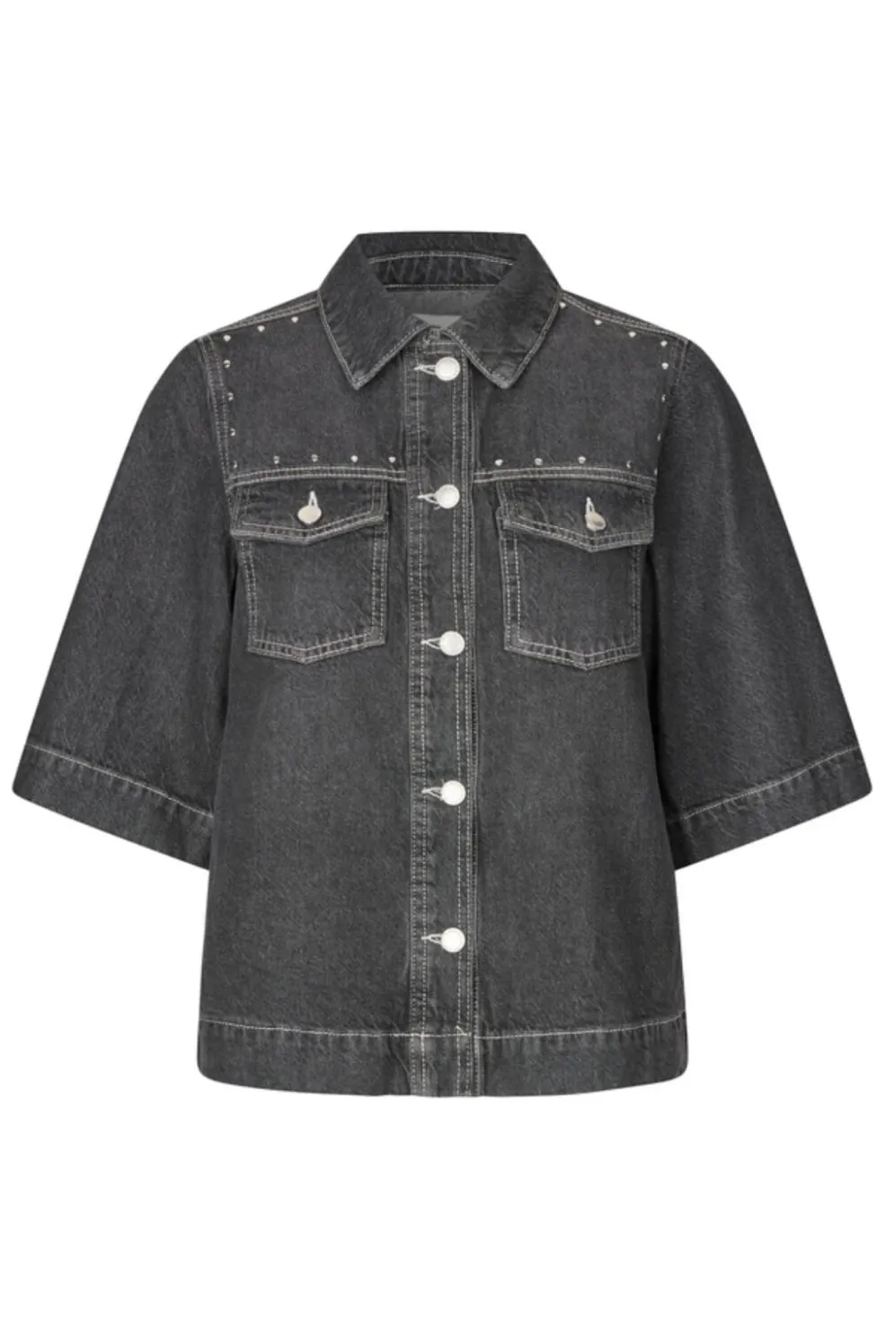 Grå denimjakke fra Global Funk med korte ærmer og skjortekrave. Jakken har dekorative nitter på skuldrene og syninger langs sømmene.