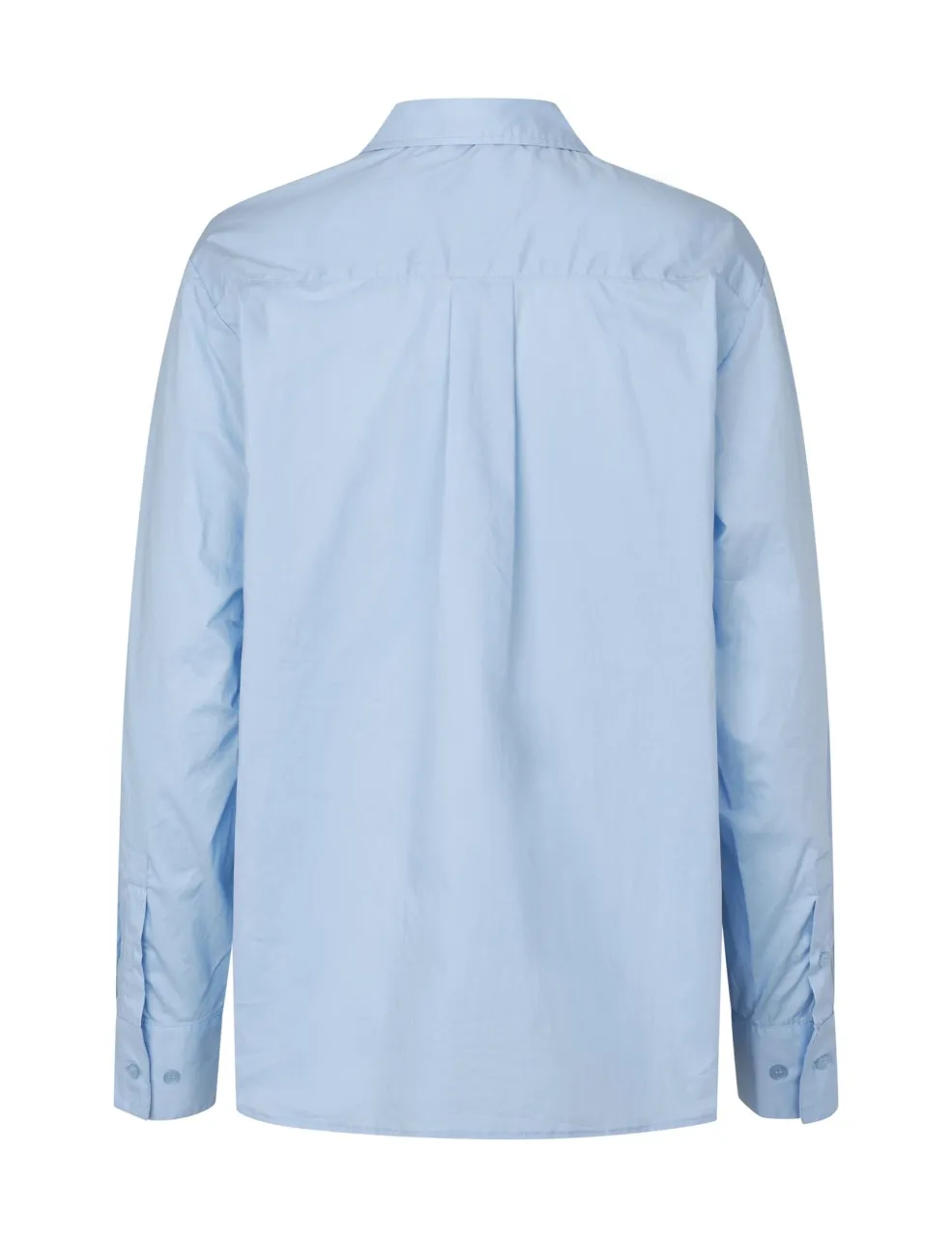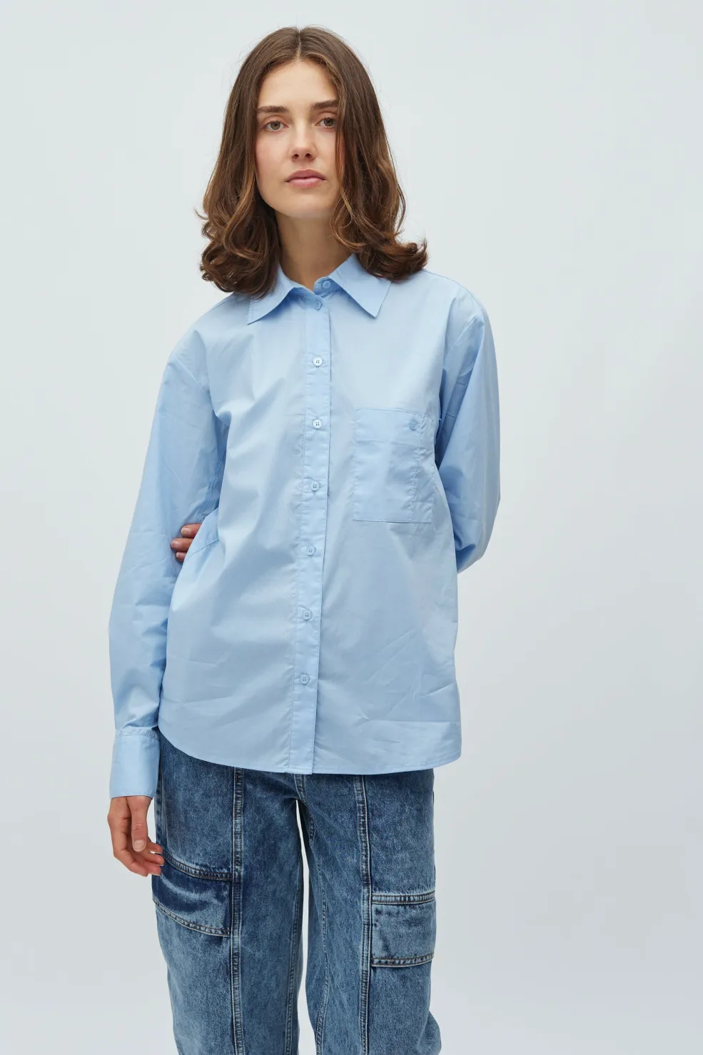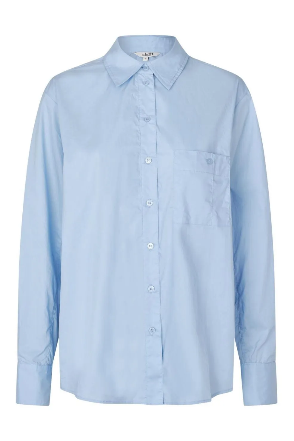 Lyseblå skjorte fra MbyM, lavet af 100 % bomuld. Skjorten har en løs pasform, lange ærmer og en knaplukning foran.