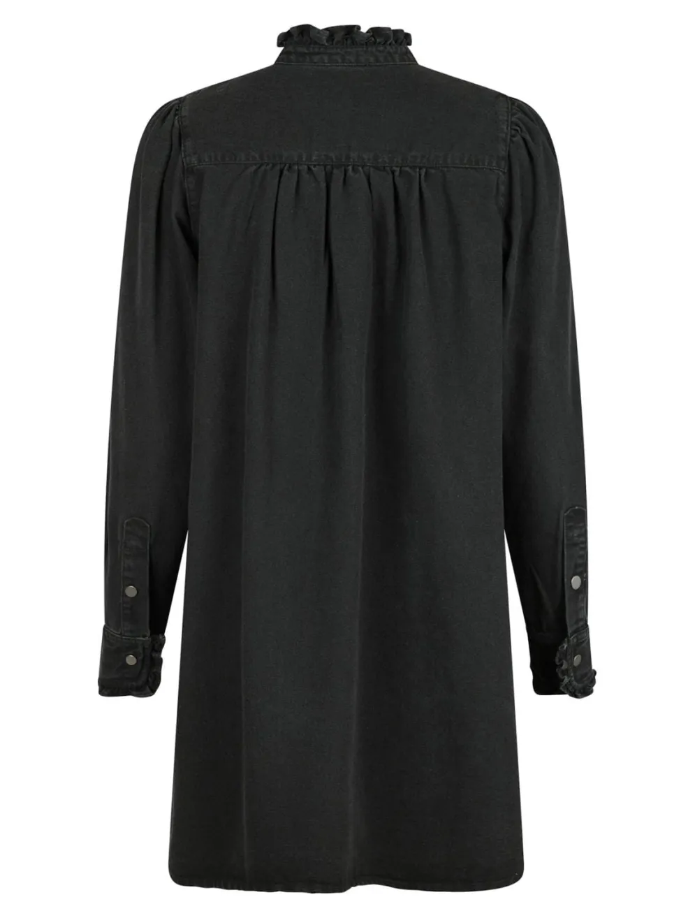 Sort denimkjole med høj hals og knaplukning foran. Kjolen har rynkede detaljer ved kraven og ærmerne samt en løs pasform, der når til midt på låret.