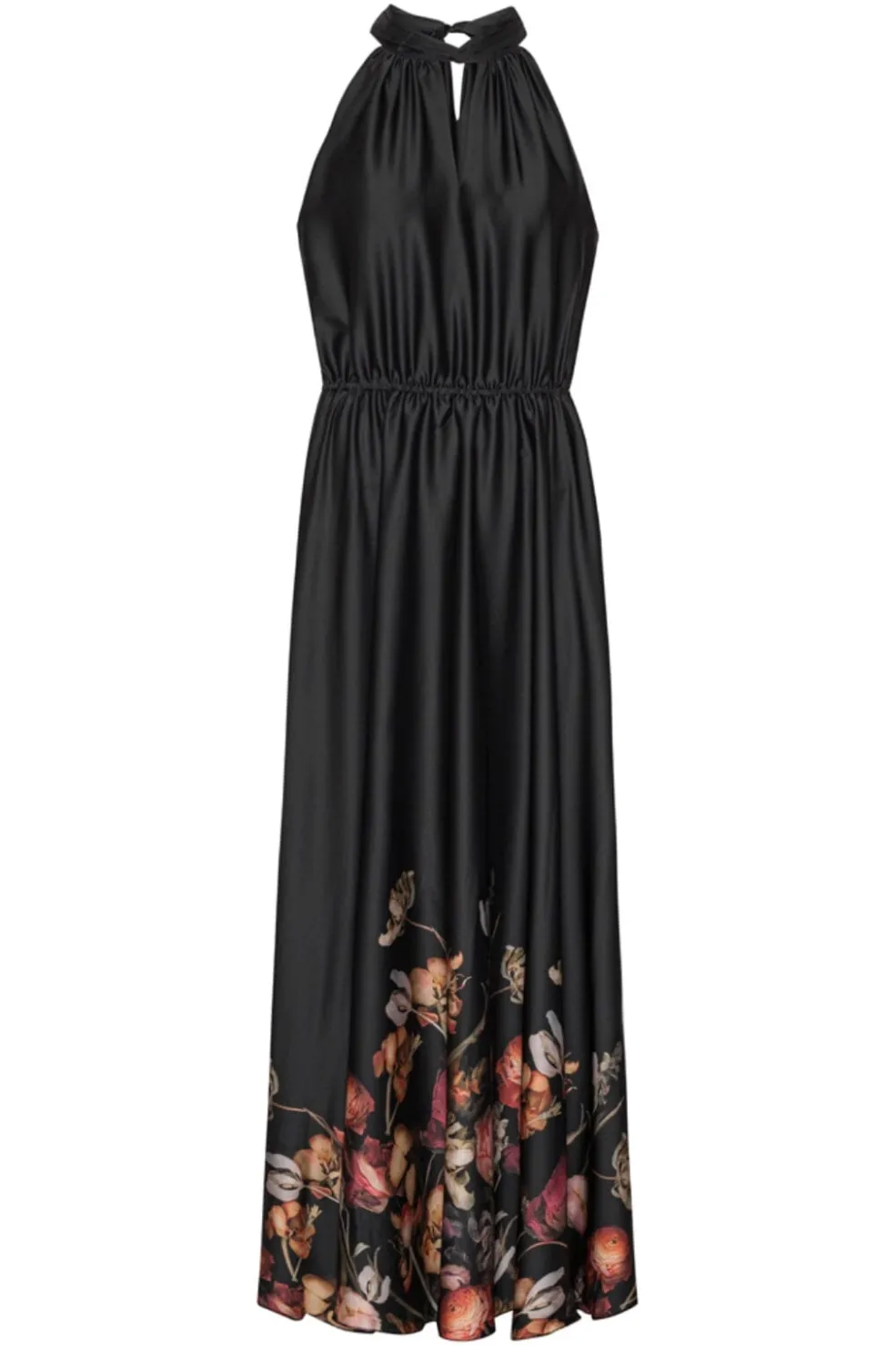 Sort maxikjole fra Karmamia med halterneck og bindebånd i taljen. Blomstermønsteret i bunden skaber kontrast til den sorte baggrund.