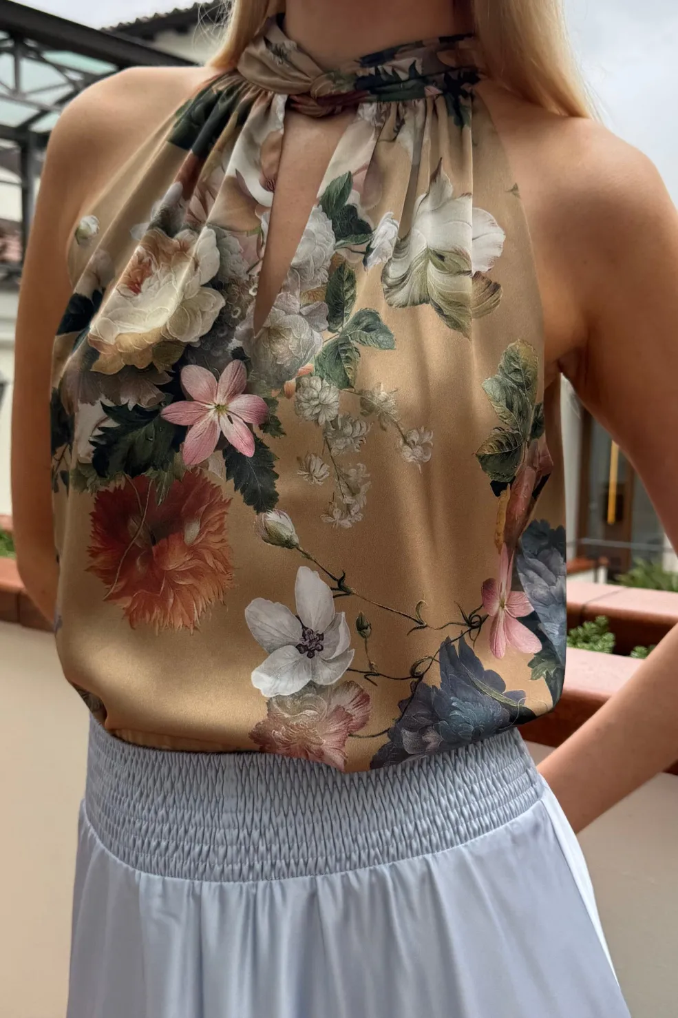 Top med blomsterprint i beige nuancer. Den høje hals har bindebånd bagpå, og det detaljerede blomstermønster viser roser og nelliker i lyse og mørke toner.