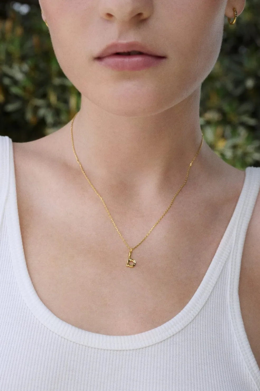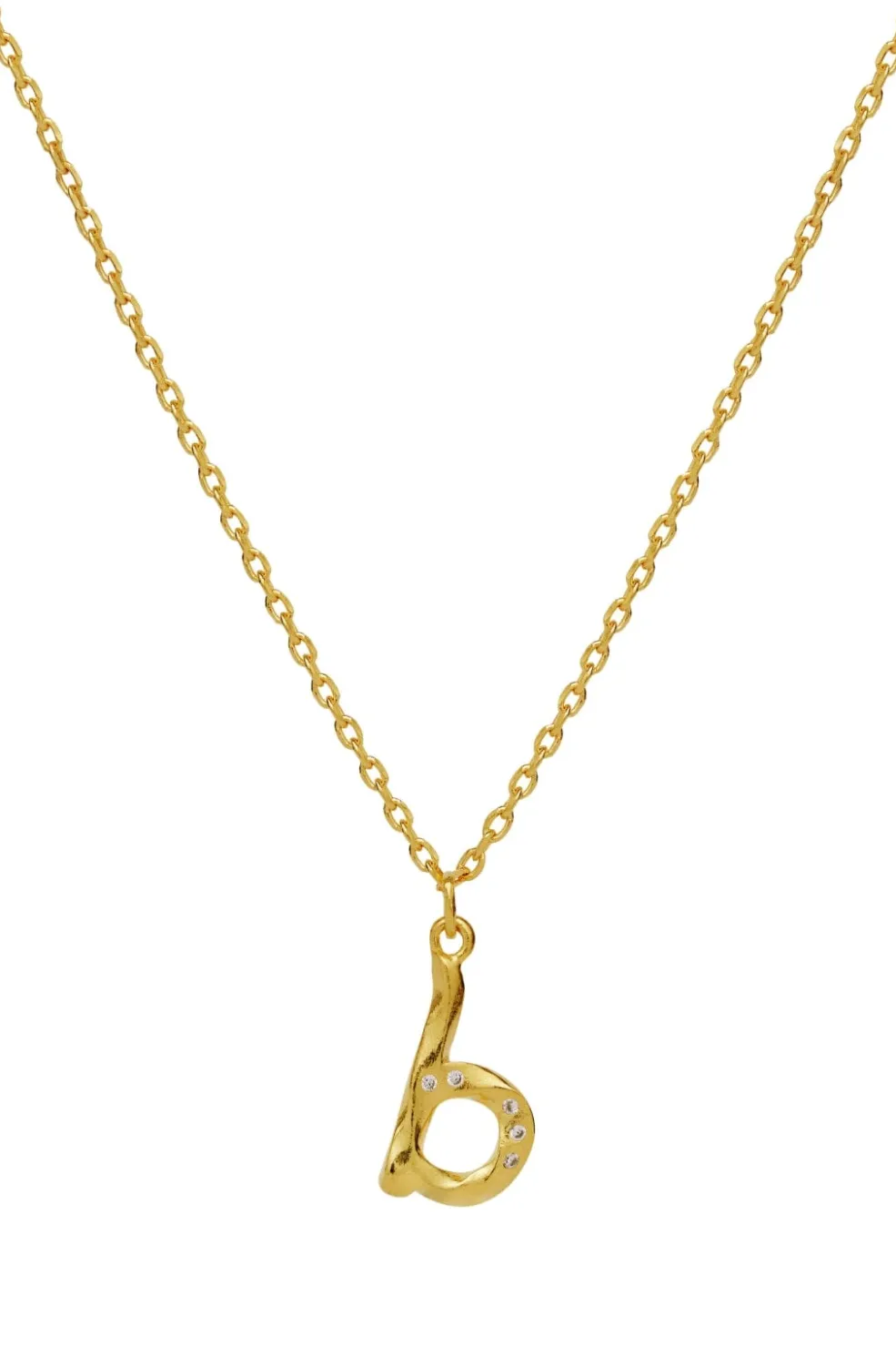 Guldfarvet halskæde fra Maanesten med bogstavet b som vedhæng. Kæden er lavet af genanvendt sterlingsølv med en 18 karat guldbelægning, der giver et blankt udtryk.