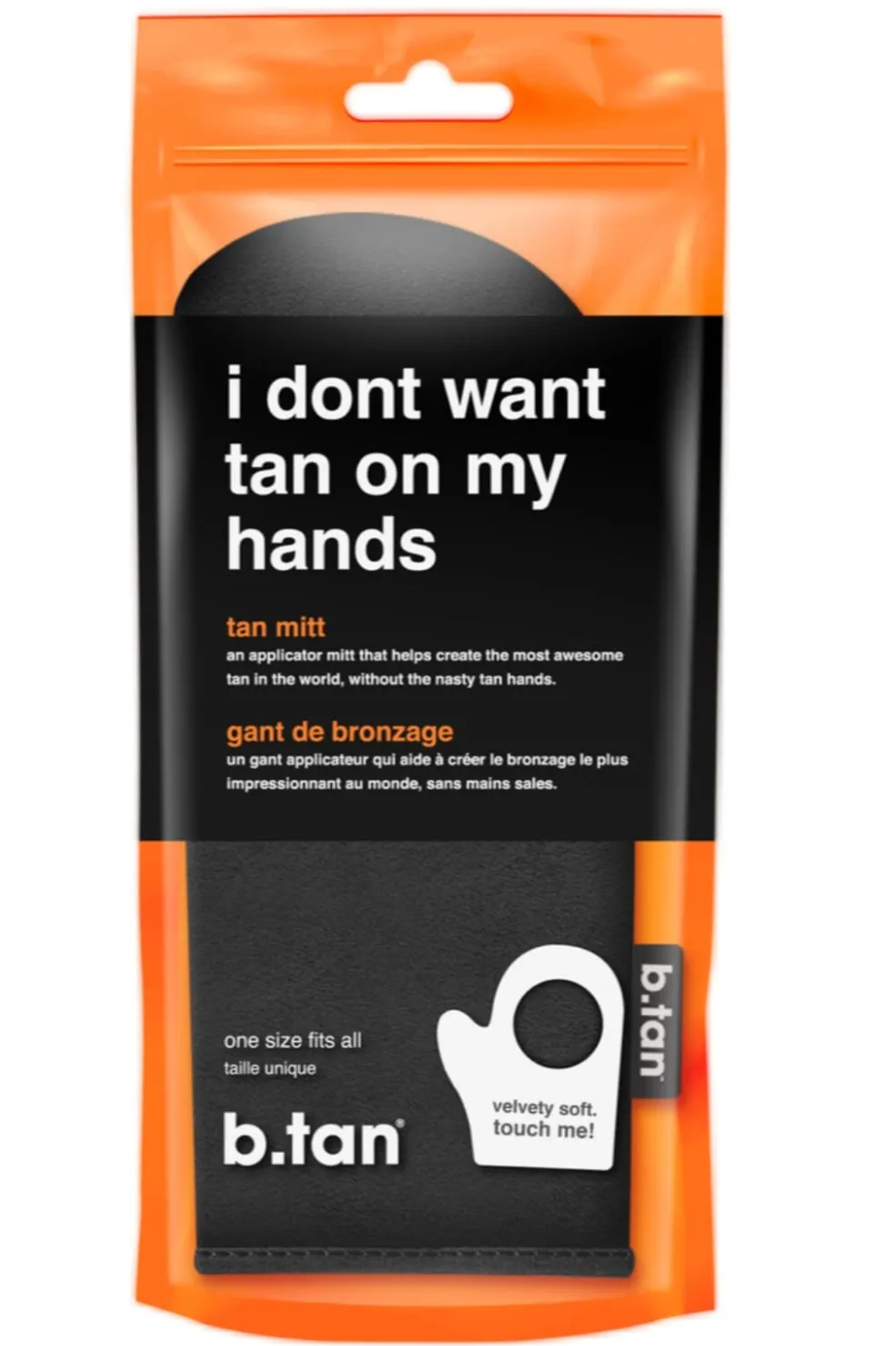En handske til påføring af selvbruner med beskyttende membran og velouroverflade. Handsken giver en jævn og kontrolleret fordeling af selvbruner.