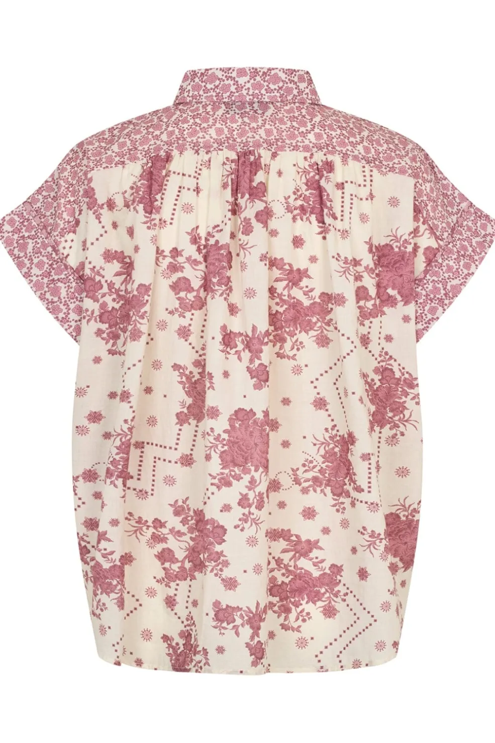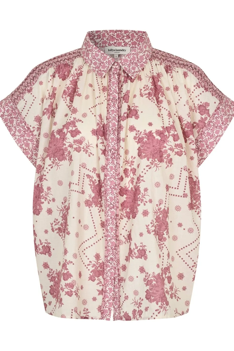 Skjorte fra Lollys Laundry med et blomstermønster i pink nuancer på lys baggrund. Den har korte ærmer og skjortekrave med knaplukning foran.