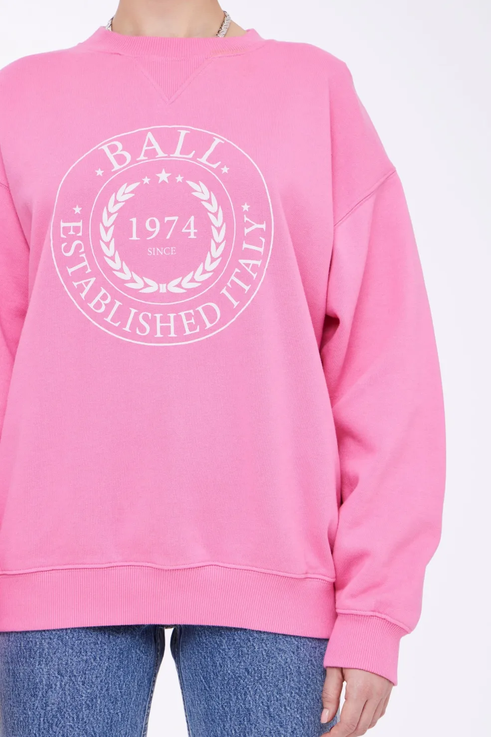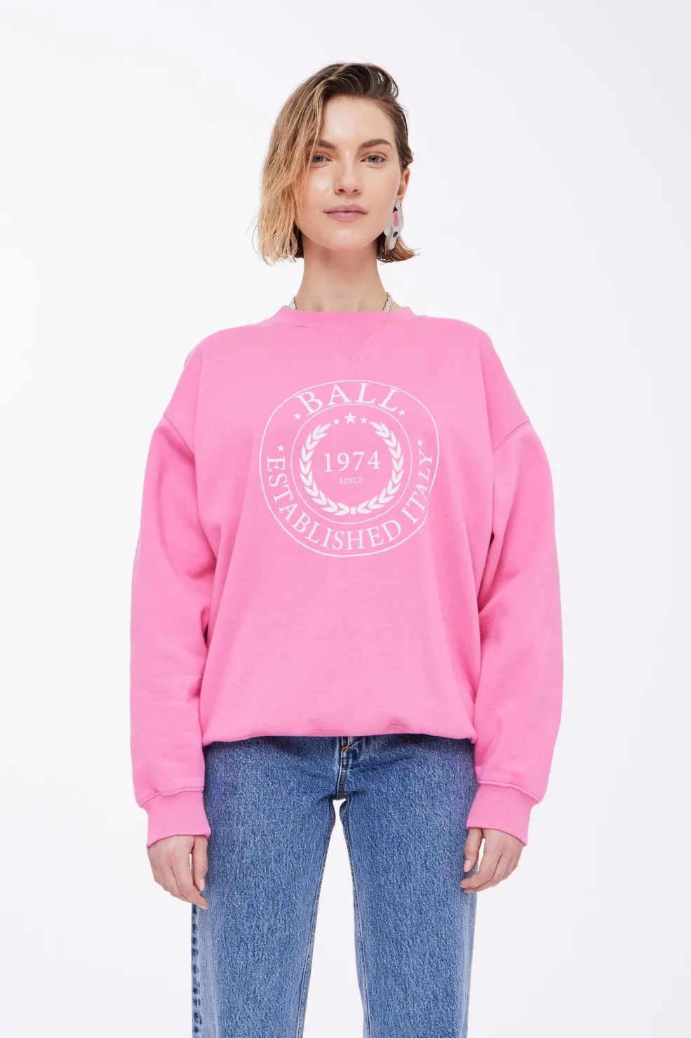 Rosa sweatshirt fra Ball med broderet logo og laurbærkrans på forsiden. Sweatshirten har en oversize pasform og kommer i en klar azalea-pink farve.