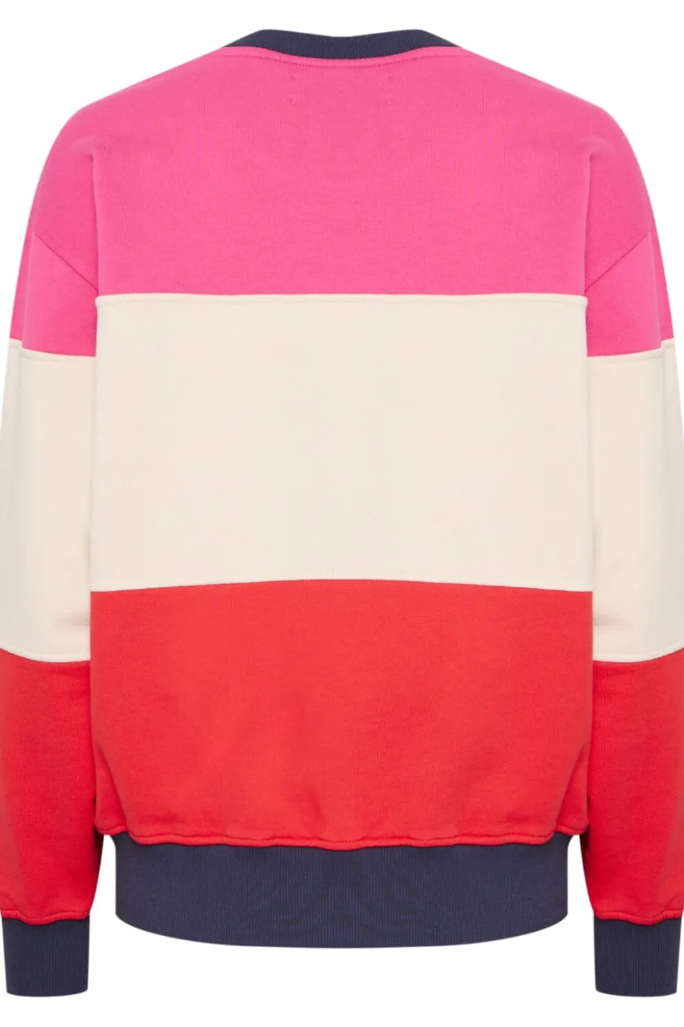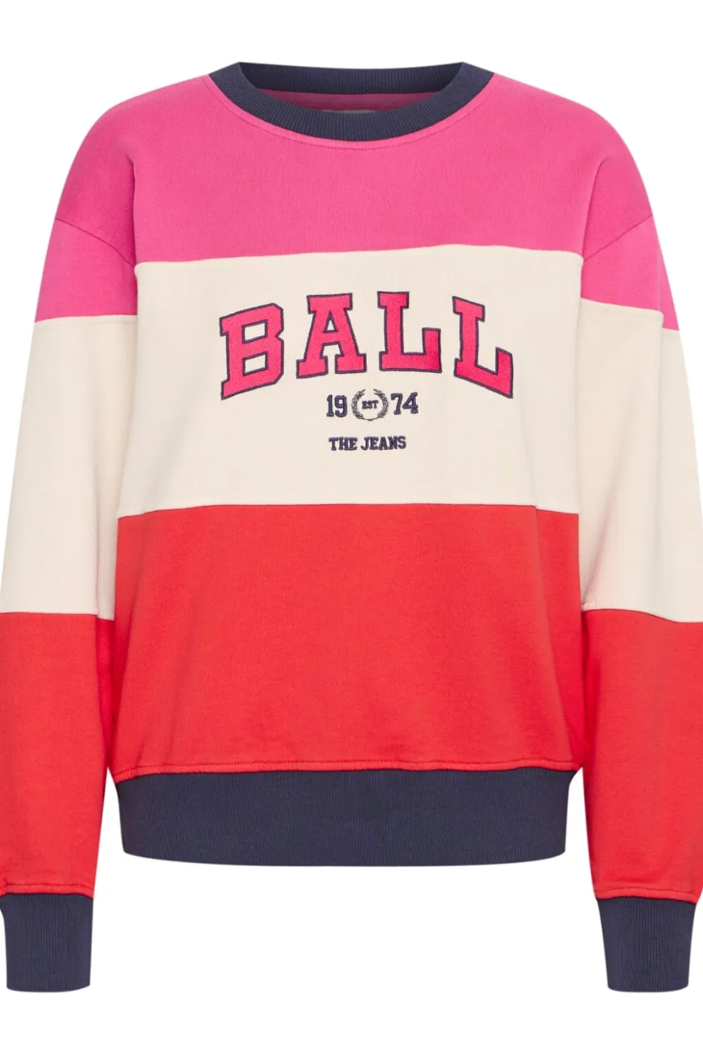 Sweatshirt fra Ball i farveblokke med pink, creme og rød. Den har rund hals, lange ærmer og broderet logo på brystet med årstallet 1974.