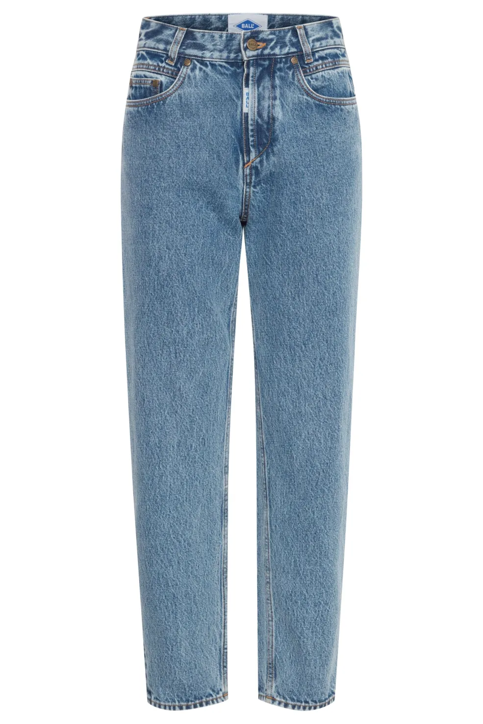 Jeans fra Ball med en lys blå marble wash-behandling. De har høj talje og tilspidset benform, der går til anklen. Lynlås og knapper i lukningen.