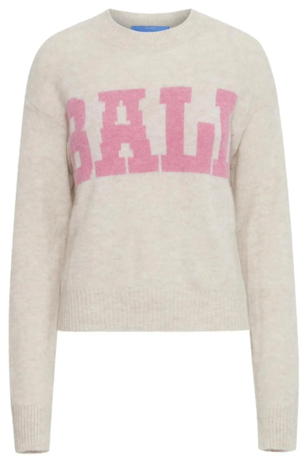 Lys beige pullover fra Ball med pink BALI-print på forsiden. Strikken har en løs pasform og rund halsudskæring med lange ærmer.