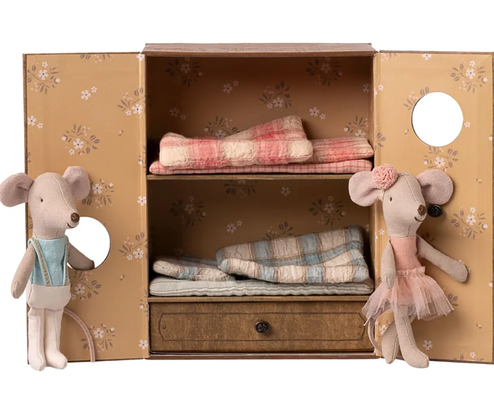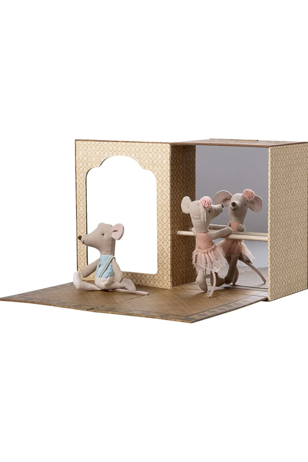 Et dansestudie med musefigurer fra Maileg i beige og brun. Æsken fungerer som både dansestudie og musehus til fantasifuld leg.