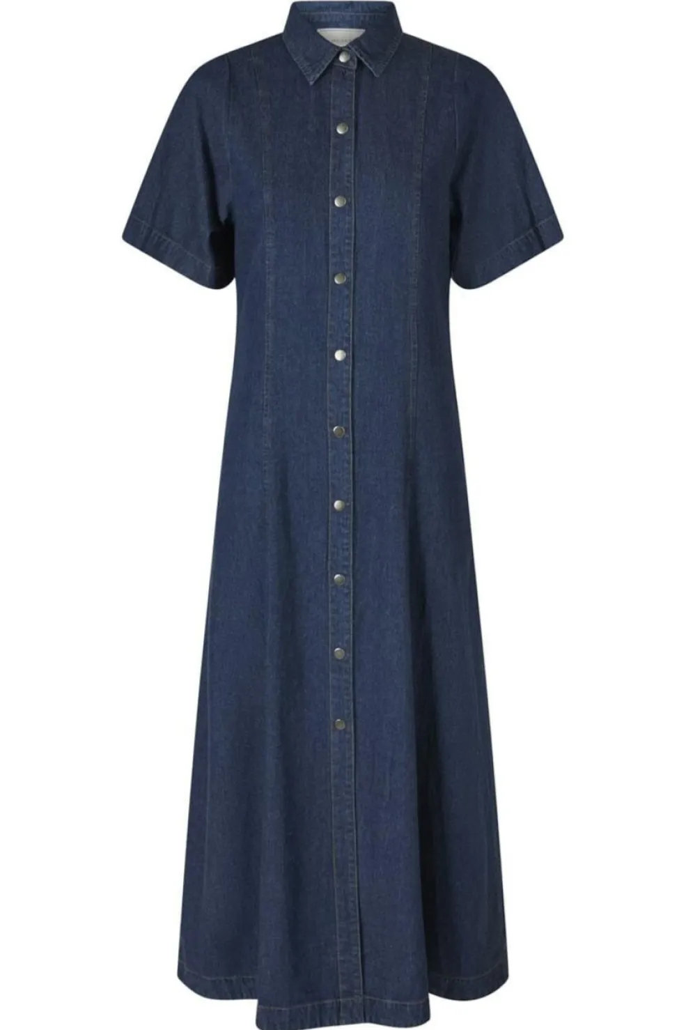 Mørkeblå denimkjole fra Neo Noir i kalvelængde. Kjolen har skjortekrave, korte ærmer og knaplukning hele vejen ned. De dekorative syninger giver kjolen et håndværksmæssigt præg.