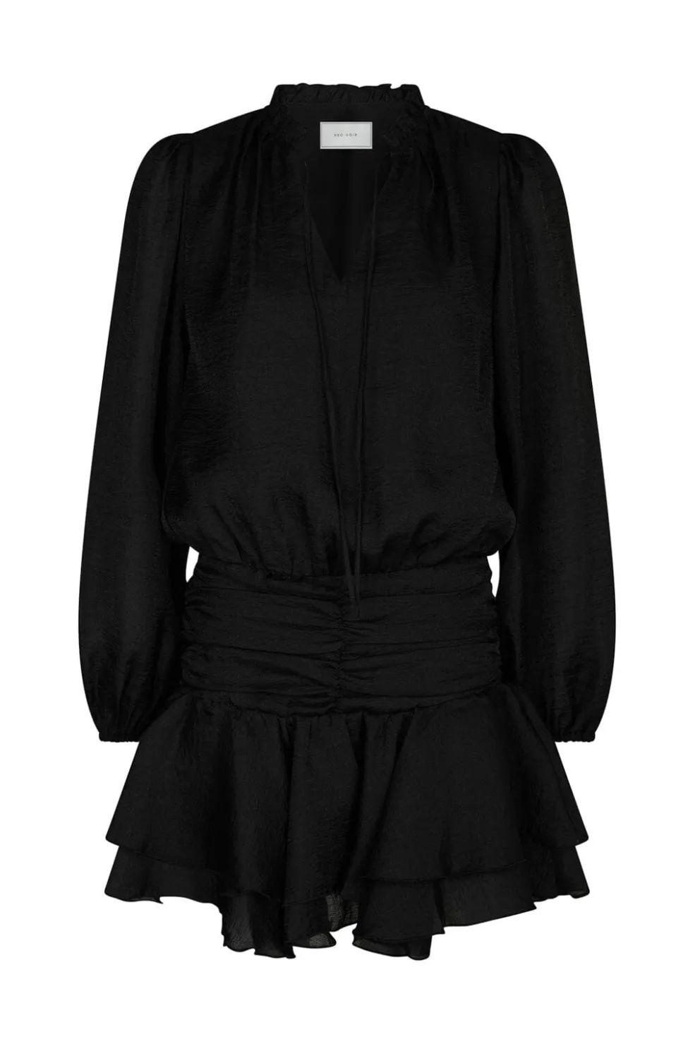 Sort chiffonkjole fra Neo Noir med V-udskæring og pufærmer. Kjolen har to lag flæser og en smocket talje med flæsekant på bagsiden.