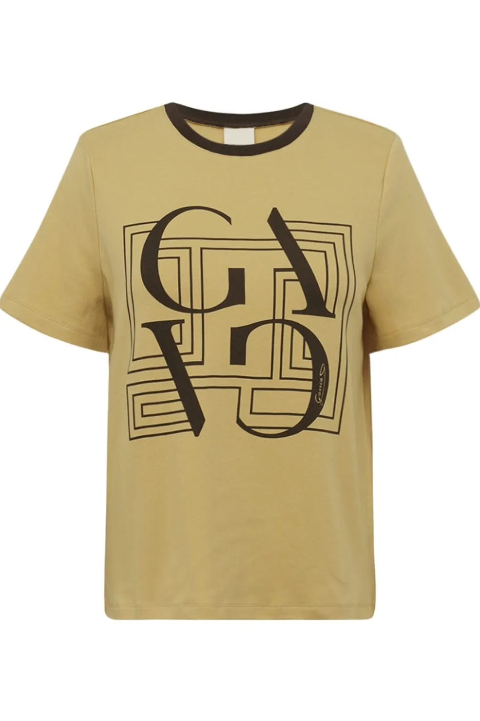 T-shirt fra Gossia i en varm honningfarve med sort grafisk print. Den har en rund halsudskæring med kontrasterende kant og et geometrisk mønster på forsiden.