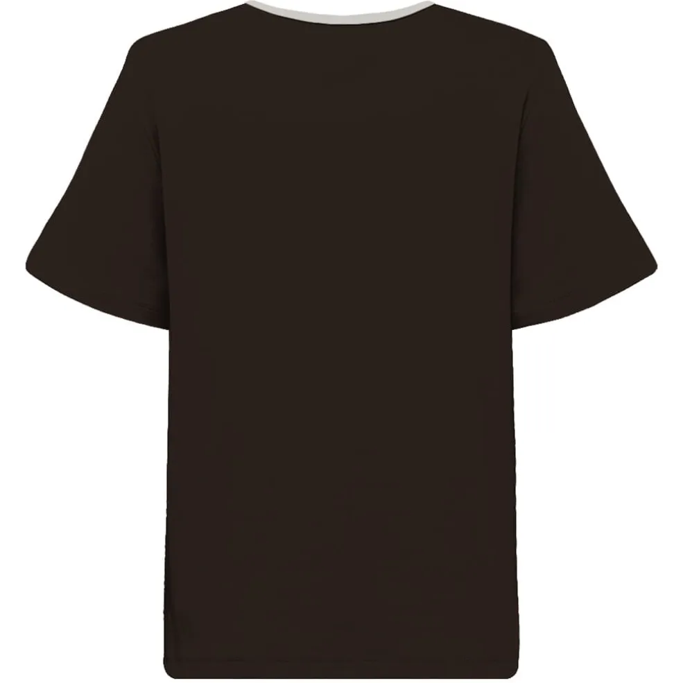 Brun T-shirt fra Gossia med et stort grafisk print på forsiden. T-shirten har en rund halsudskæring i lys kontrastfarve og korte ærmer. Printet viser bogstaverne G og A med geometriske linjer.