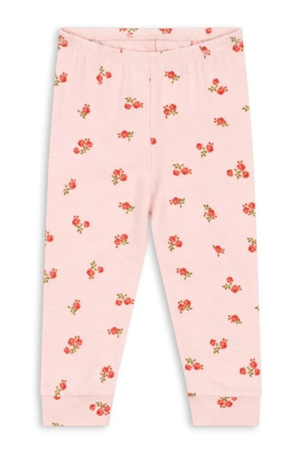 Lyserøde bukser fra Konges Sløjd med røde blomster. Bukserne har en elastisk talje og manchetter ved anklerne.