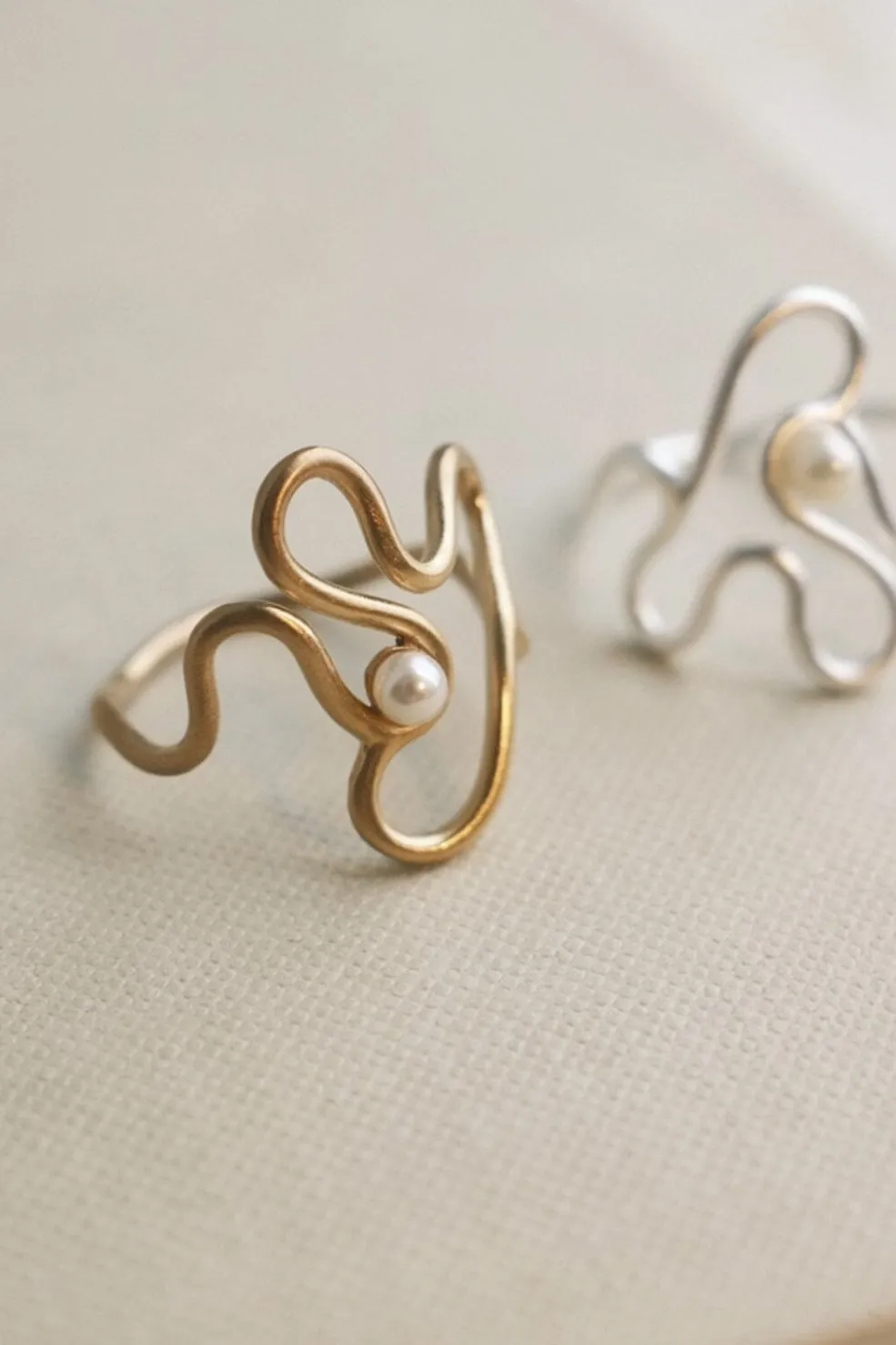 Guldbelagt ring fra Pernille Corydon med et bølget design og en hvid perle. Ringen har en organisk form, der snor sig omkring fingeren med perlen som midtpunkt.