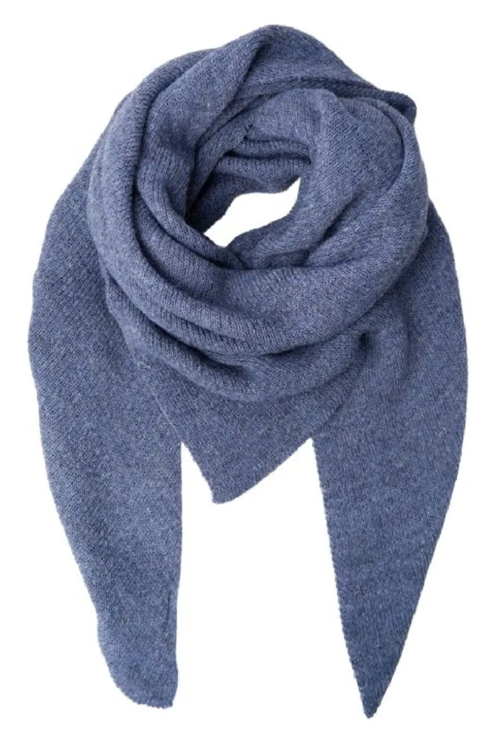 Mørkeblåt tørklæde fra Black Colour med trekantet form og synligt strikmønster. Tørklædet har spidse ender og en ensfarvet overflade i en klassisk jeansnuance.